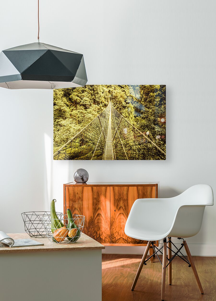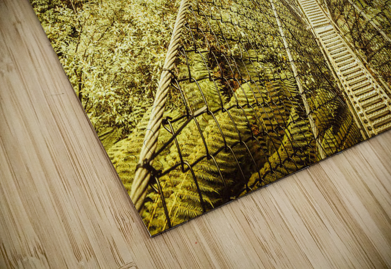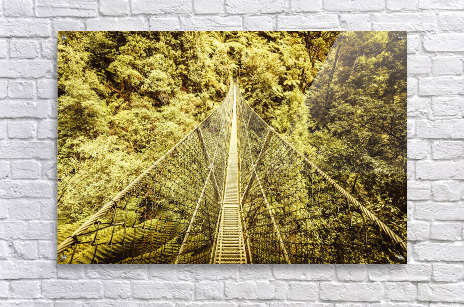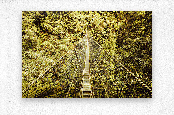 Sway bridge scene over the canopies of a lush dense temperate rainforest. Montezuma Falls Western Tasmania Australia