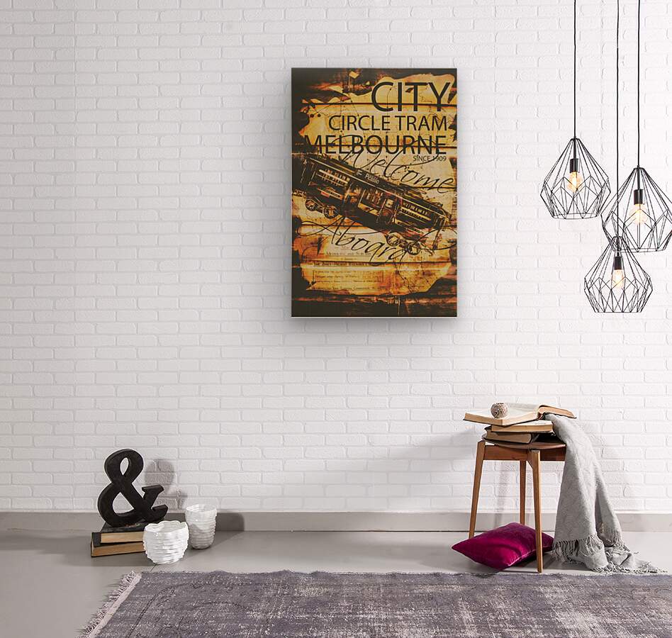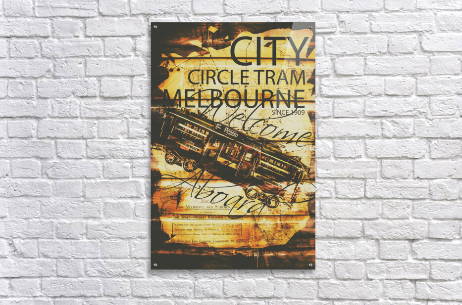 Advertising artwork from the old world with a rustic Melbourne City Circle Tram on ticketing booth wall panel