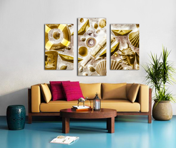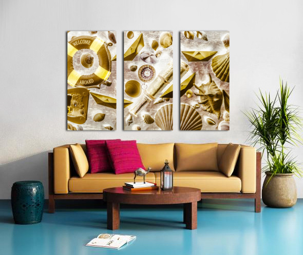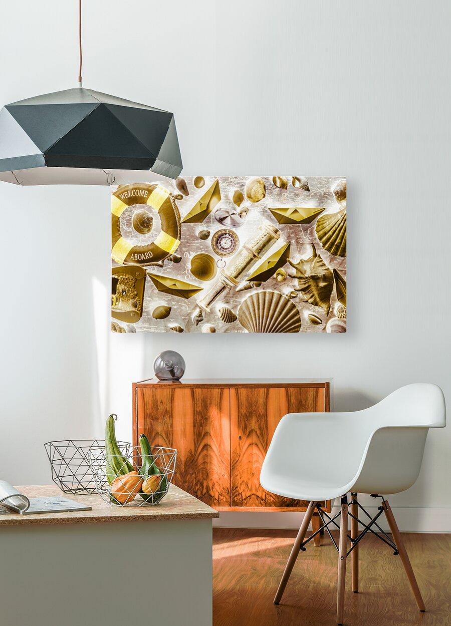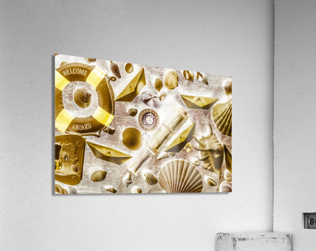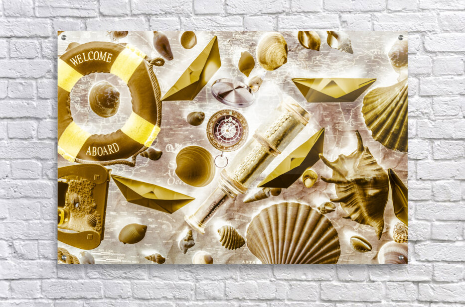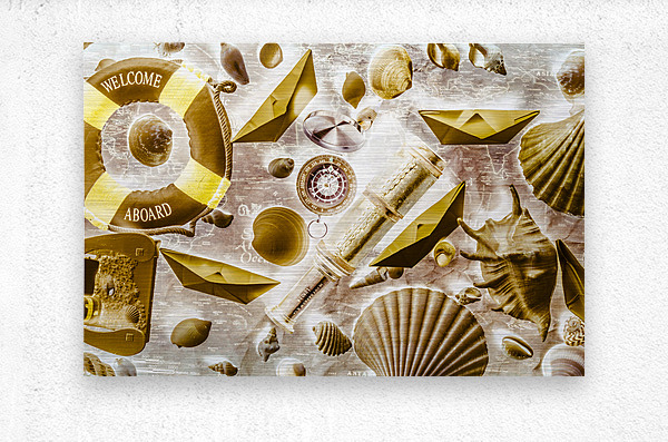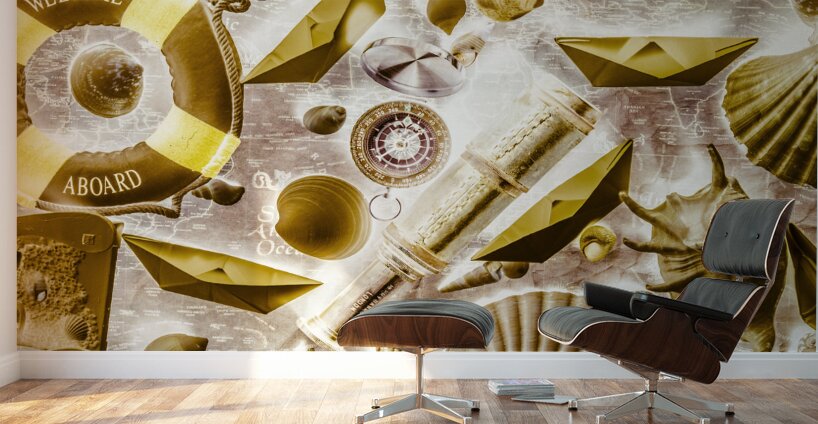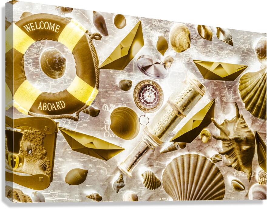 Retro pop art on a sailing expedition of still life icons on old world mapping. Seafarers way
