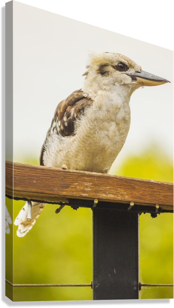 Australian wildlife portrait on a native kookaburra perched on veranda railing. Taken: Queensland