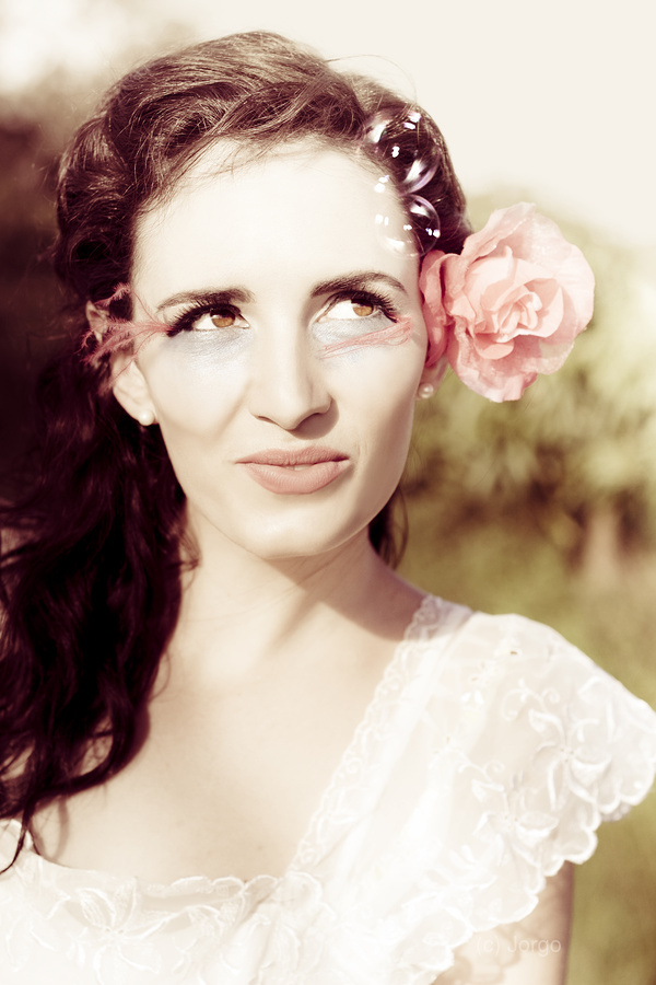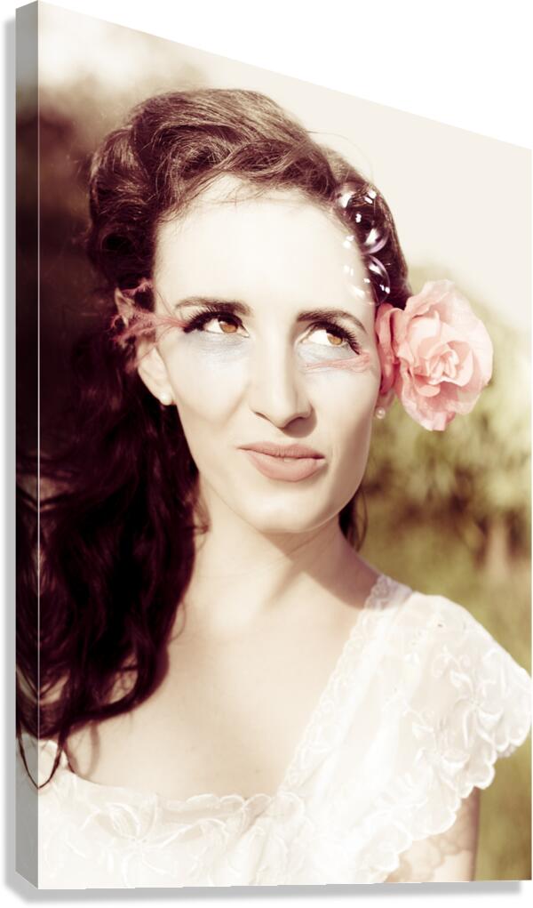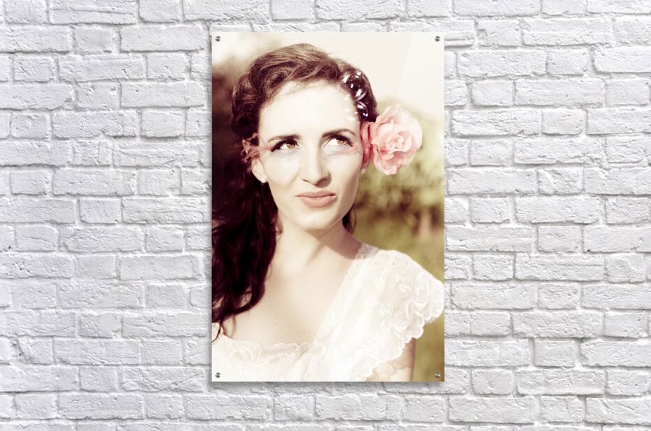 A Happy Vintage Woman Watches Two Small Bubble Touch And Connect Above Her Head In A Retro Concept Symbolizing A Romantic Love Connection