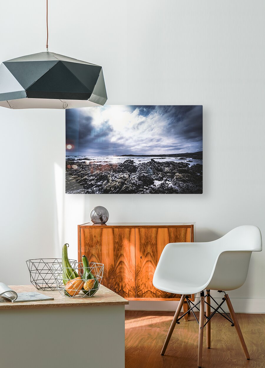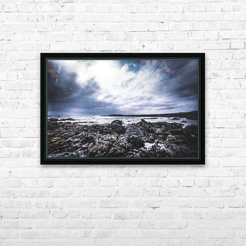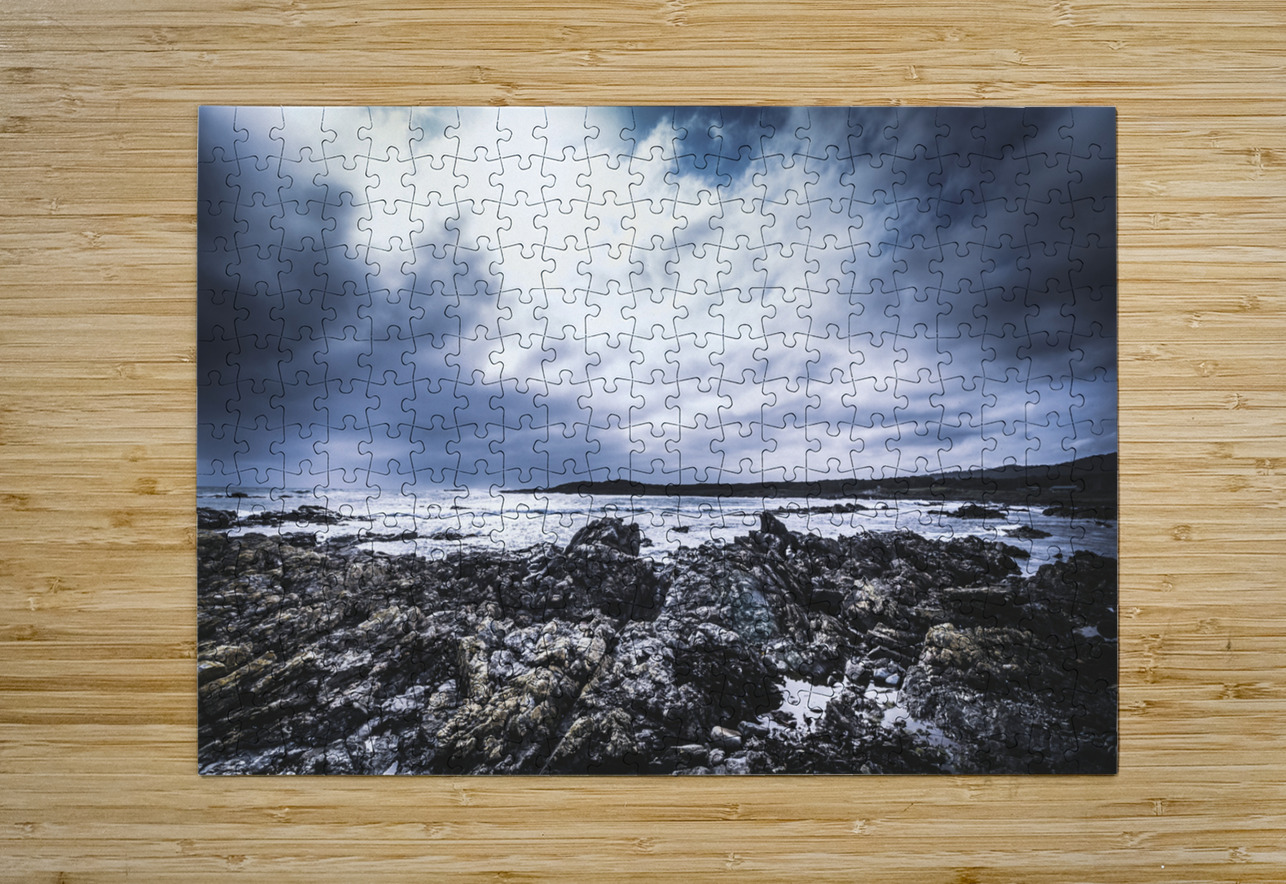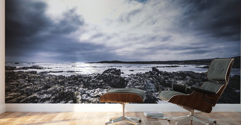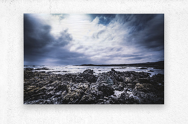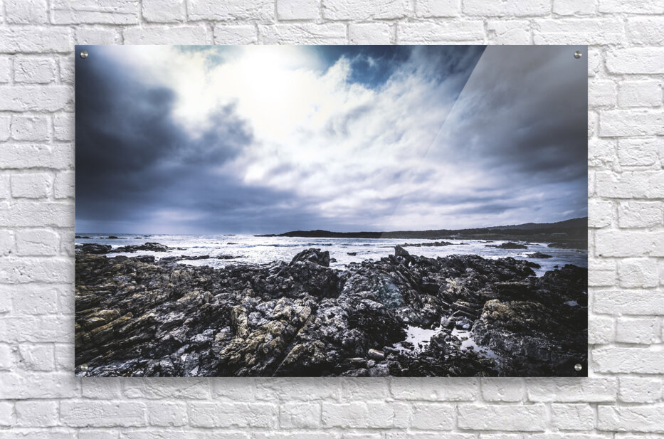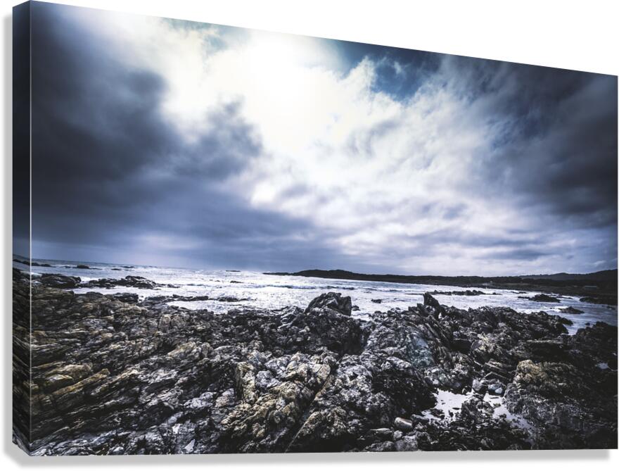 Atmospheric seaside landscape on a rocky foreshore before stormy dark ocean waters. Granville Harbour West Tasmania Australia