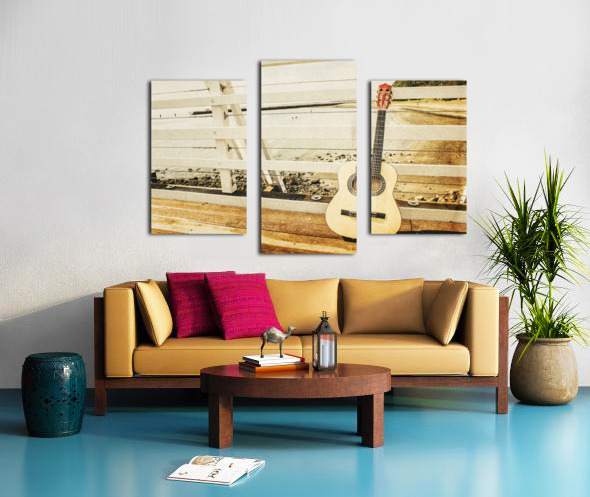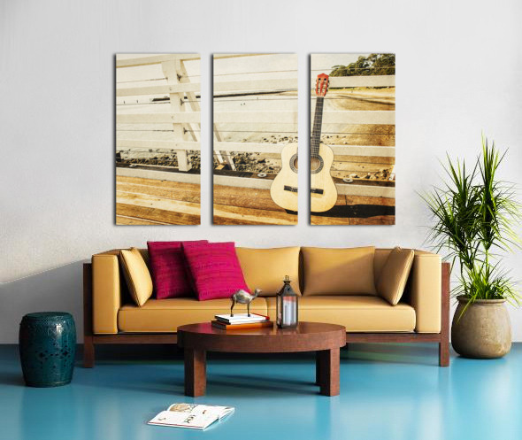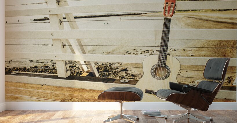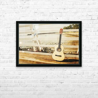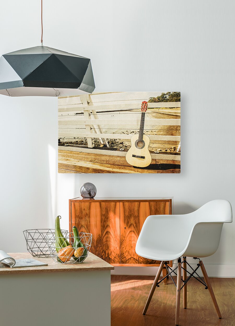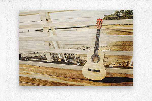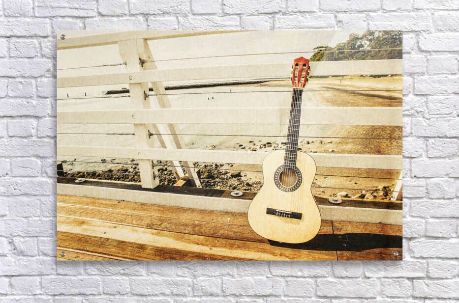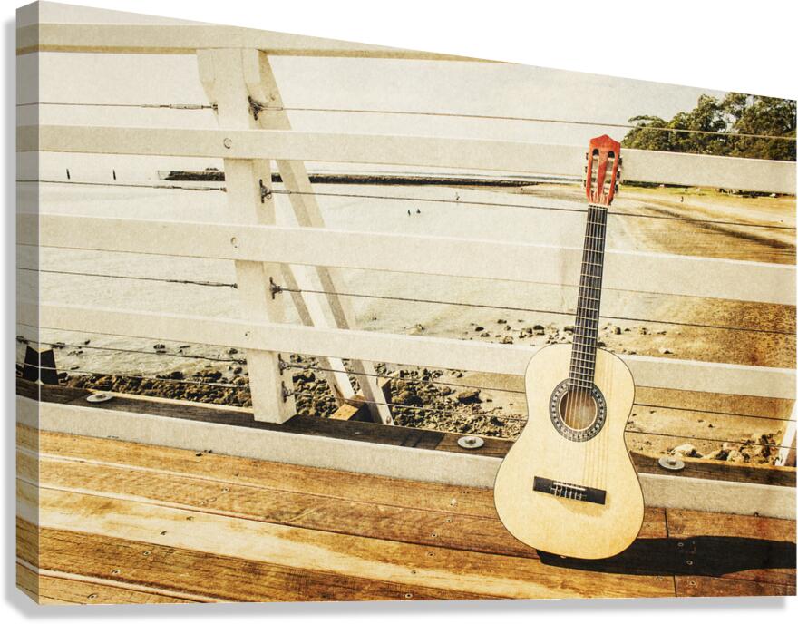 Classic music concept on a ocean dock guitar an a old harbour background. Old songs at Shorncliffe Pier Queensland Australia