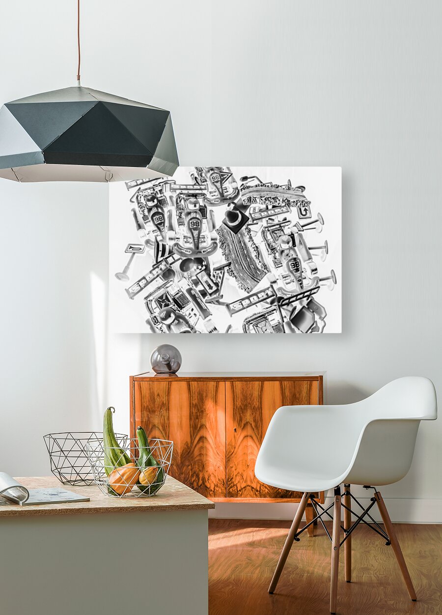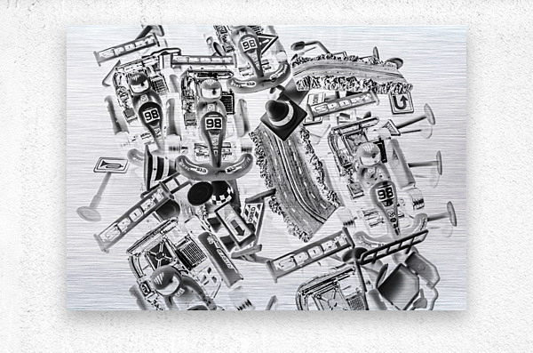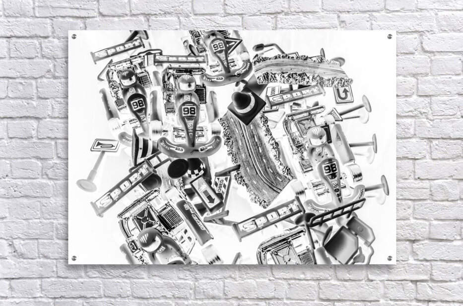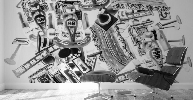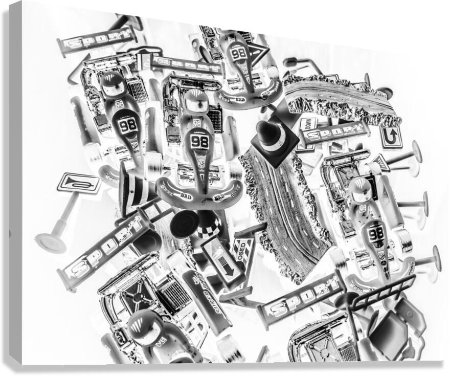 Black and white fine artwork on a track meet of epic go karting competition. Kart speedway