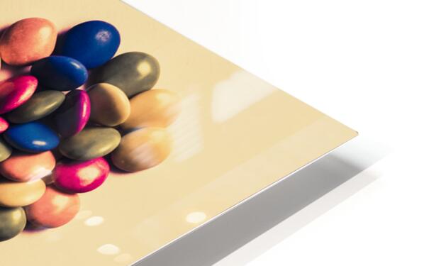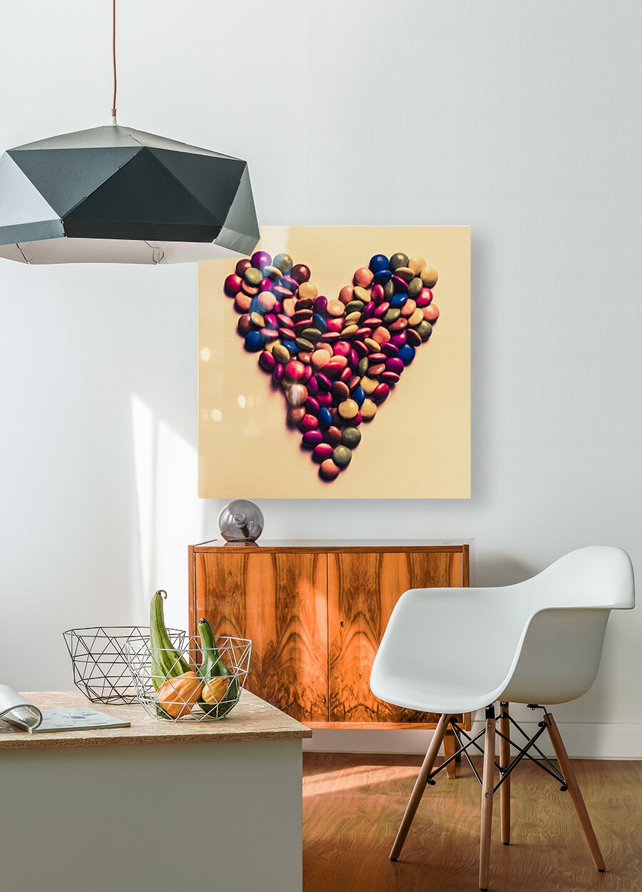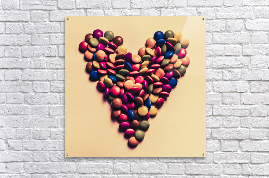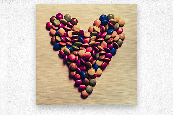 Retro filtered food photo on a merged mix of colour candy pieces forming a heart shape. Valentines day treats