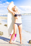 BLONDE SURFBOARDER WITH SURFBOARD AT BEACH