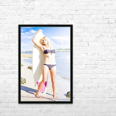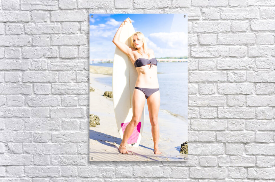 Get this artwork "Blonde Surfboarder With Surfboard At Beach" in a framed print.