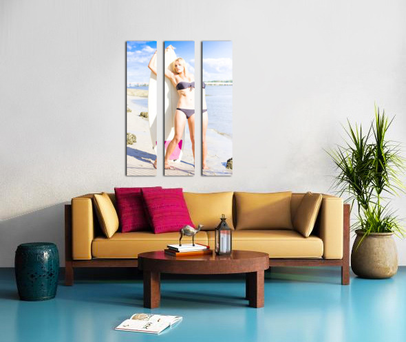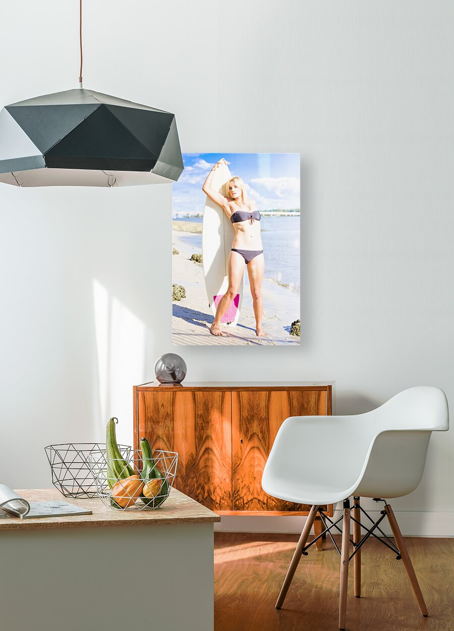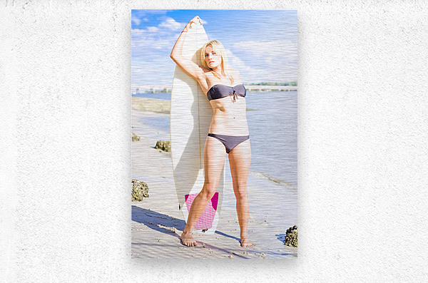 ABOUT THIS ARTWORK: BLONDE SURFBOARDER WITH SURFBOARD AT BEACH