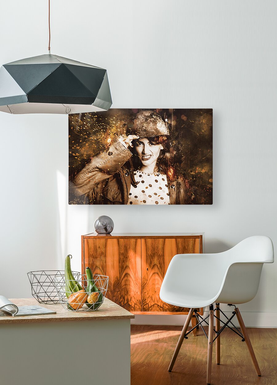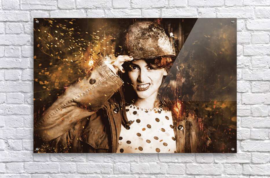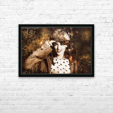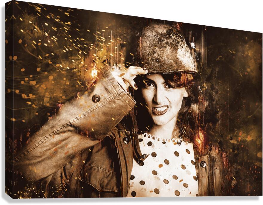 Digital fine art of a beautiful young woman fighting a battle of epic proportions on a chaotic fiery and explosive war torn battlefield. Tough pin up soldier