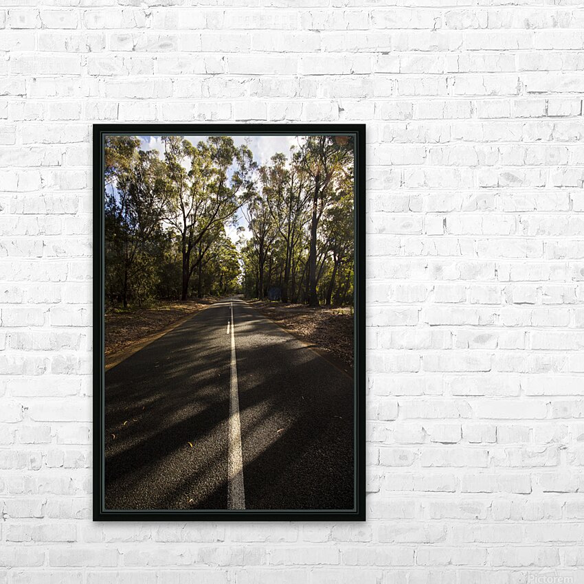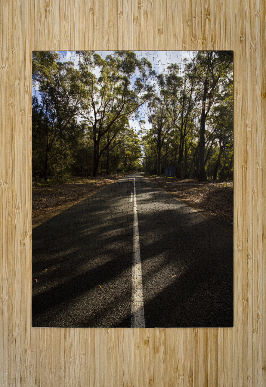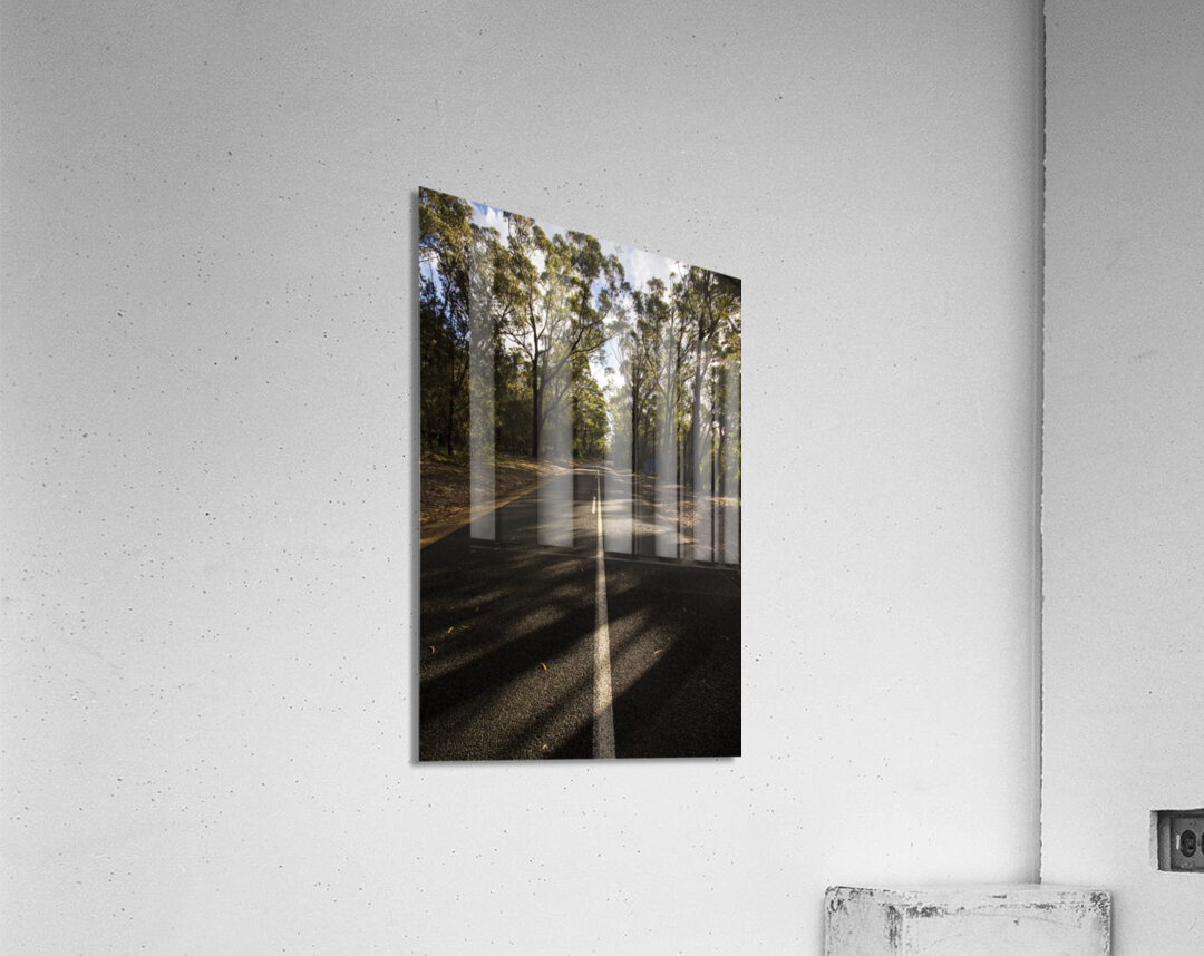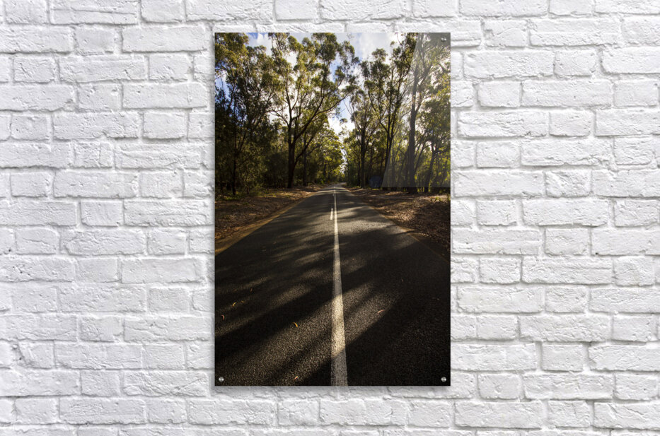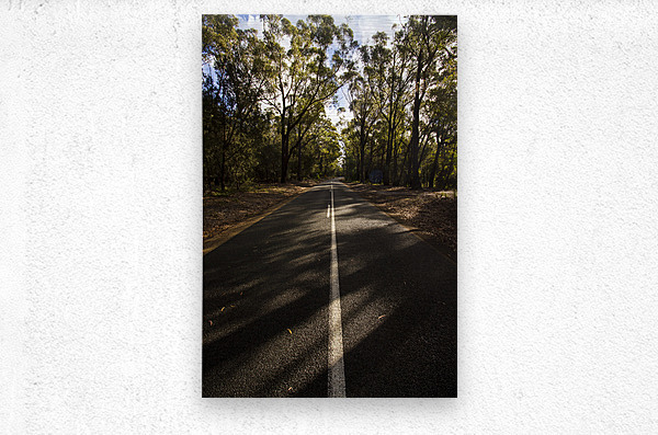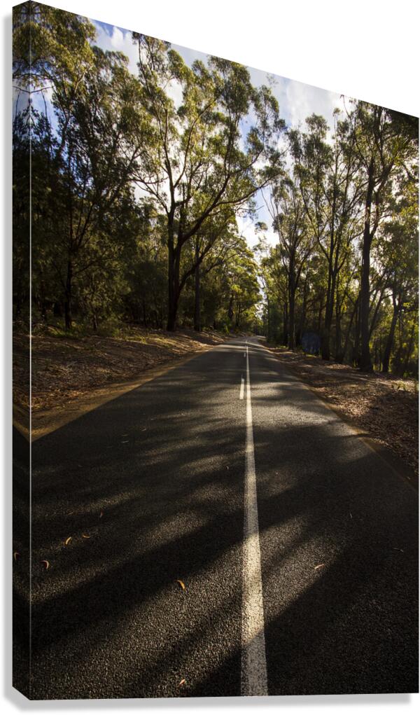 Forestry road landscape leading through Australian afternoon bush with tree shadows. Chain Of Lagoons Tasmania Australia
