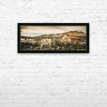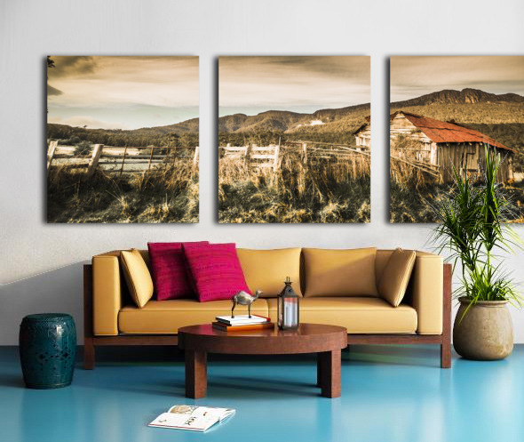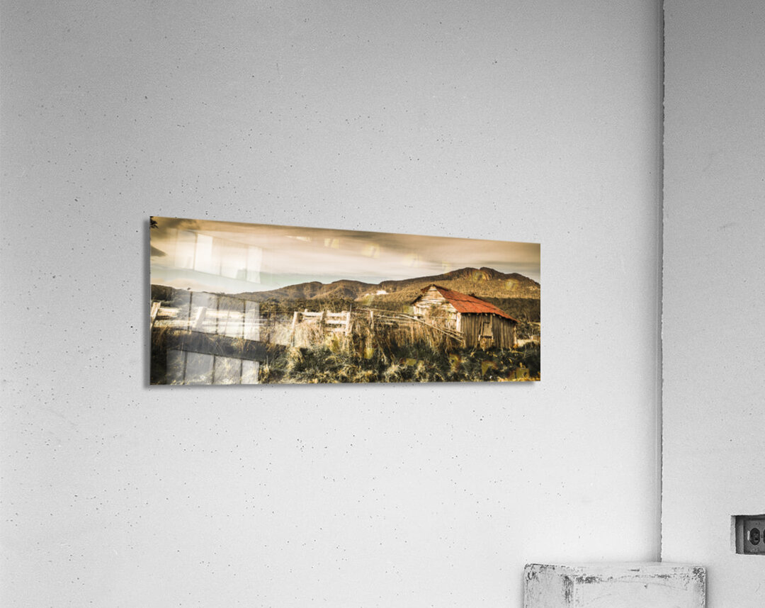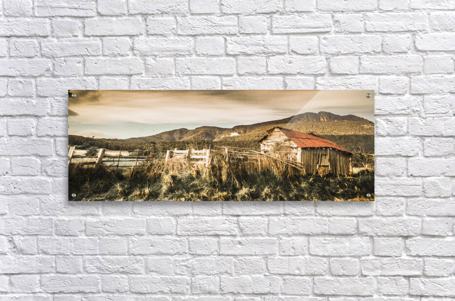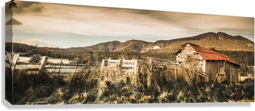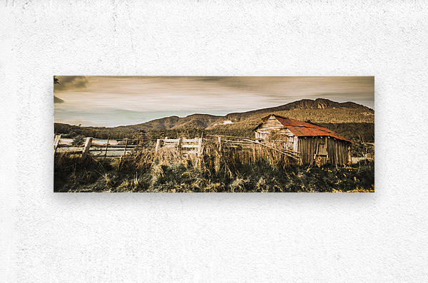 Parnoramic country landscape on a beautiful old-fashioned shack in remote rundown pastures. Liffey Tasmania Australia
