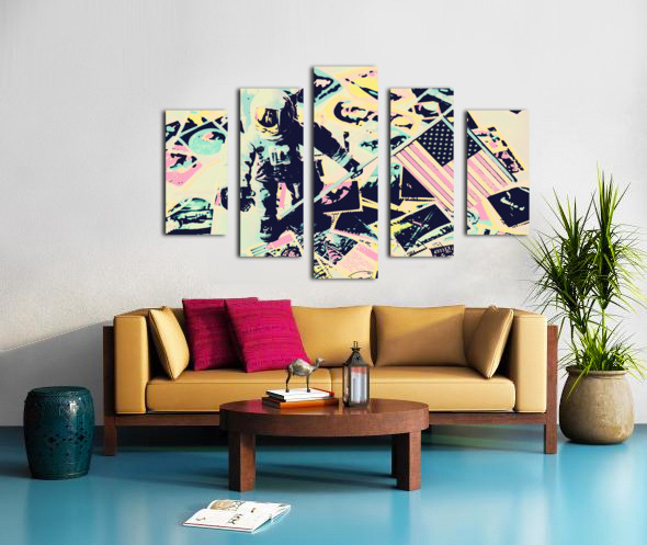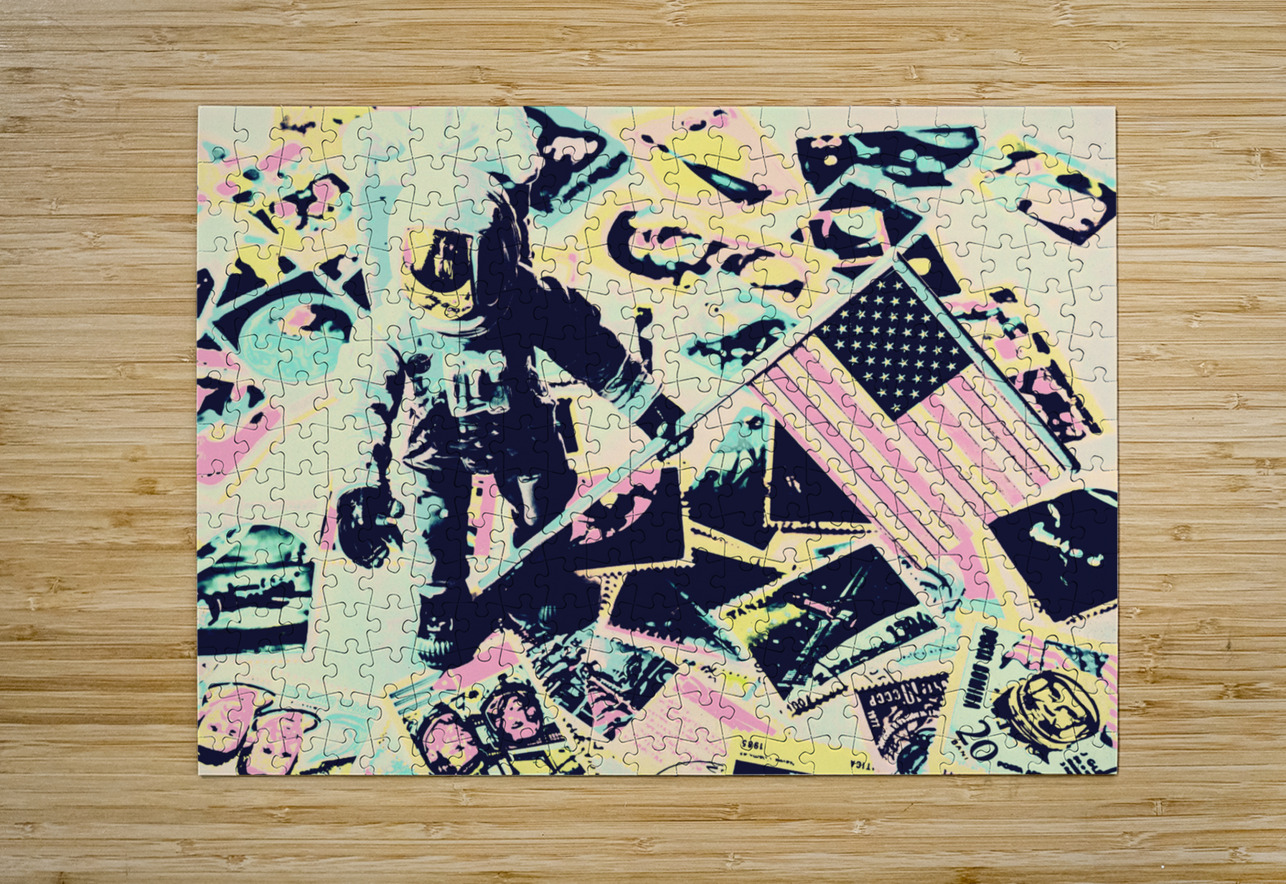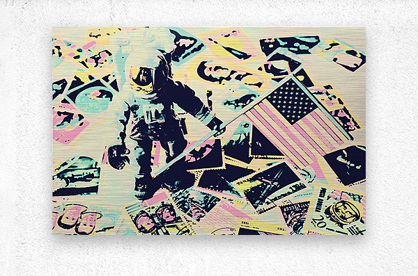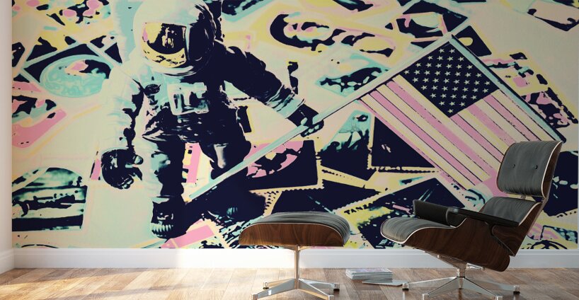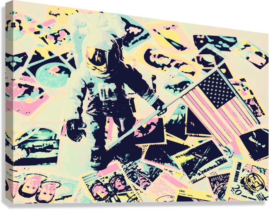 Retro sixties pop art on a spaceman walking the walk on a stamped moon landing