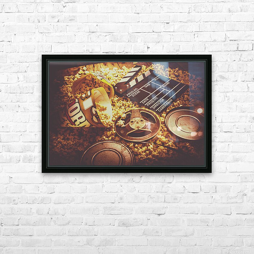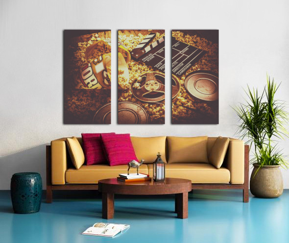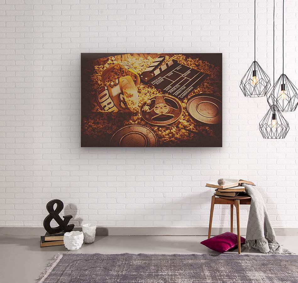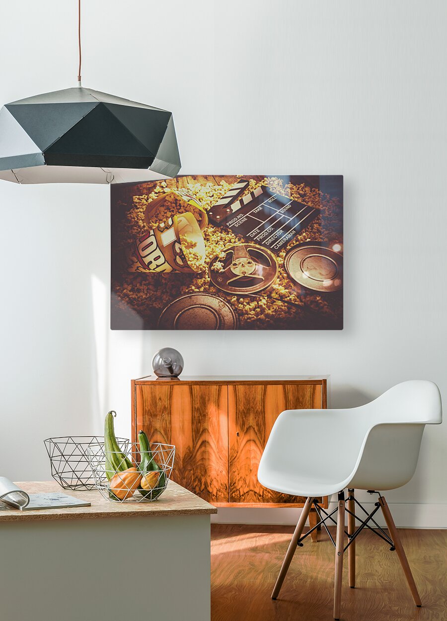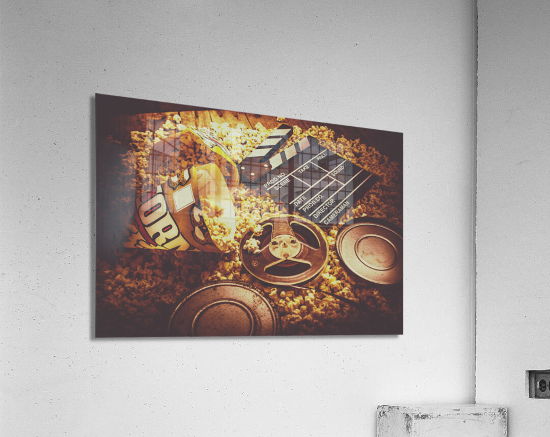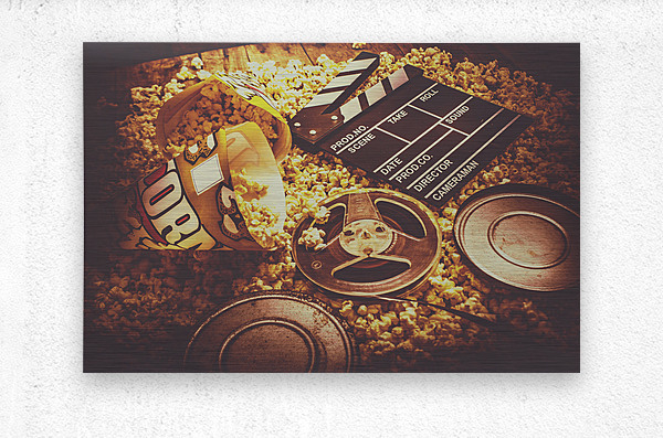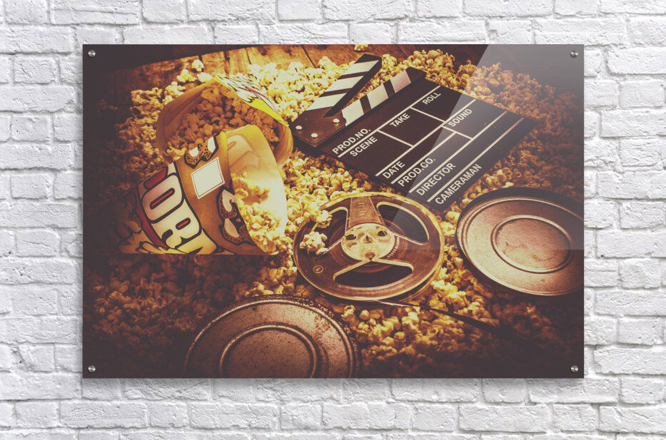 Classic movie paraphernalia in 1950s film with movie reel production slate and box office popcorn. Home cinema art