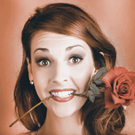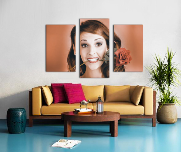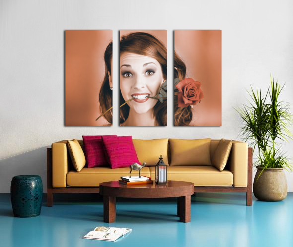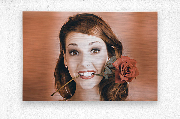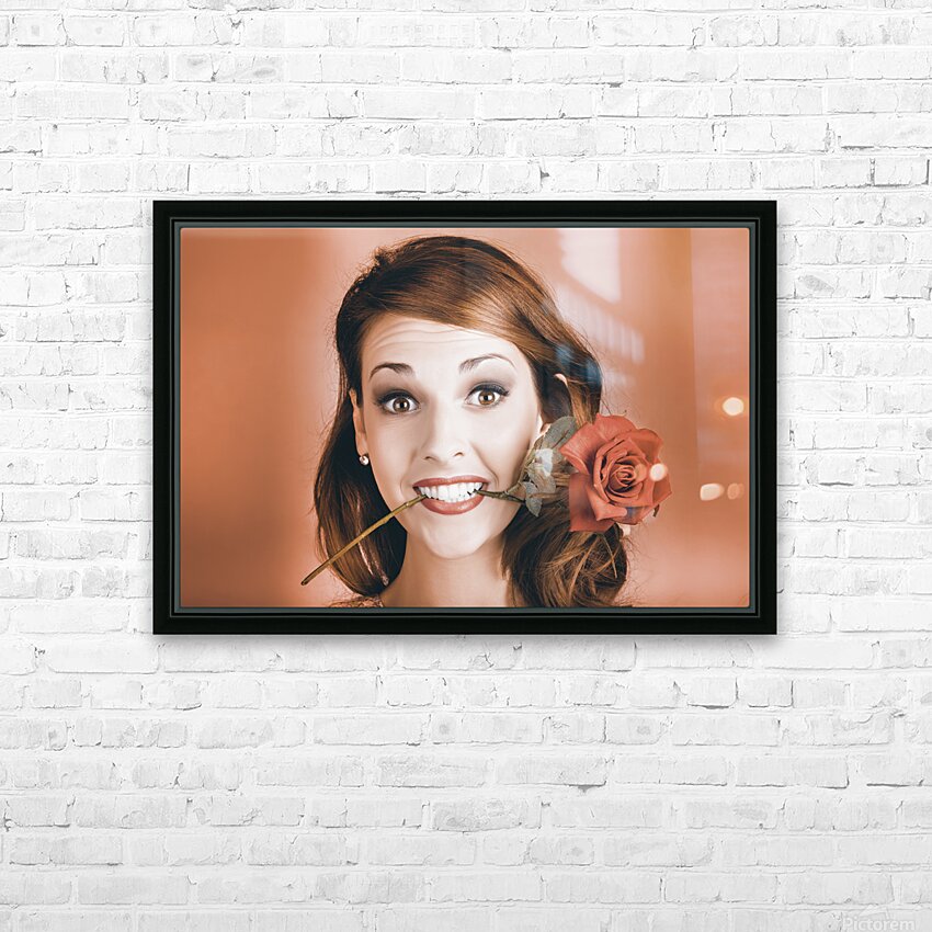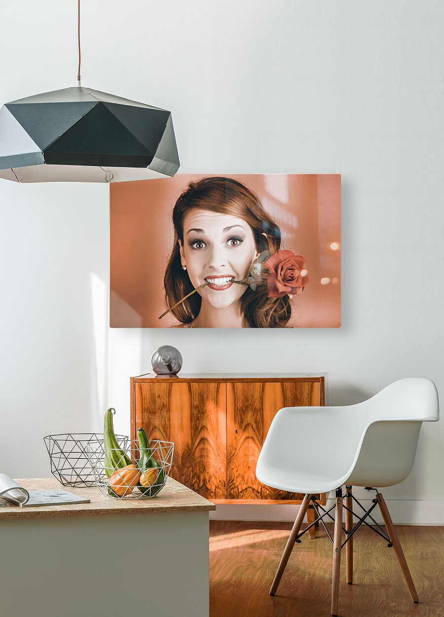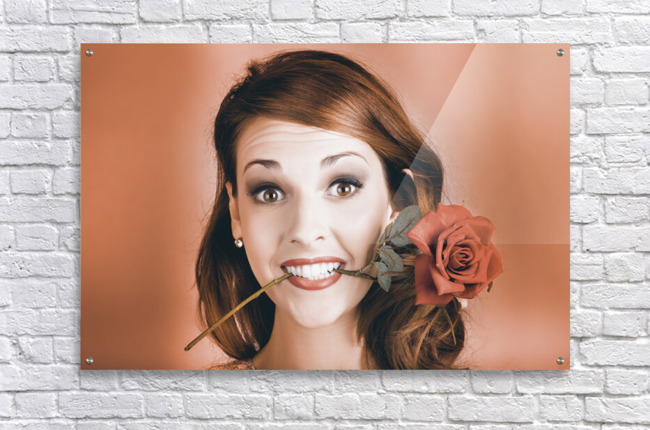 Quirky Face Portrait Of A Shocked Pinup Girl Wearing Vintage Makeup Holding A Red Rose In Mouth In A Valentines Day Gift Conceptual