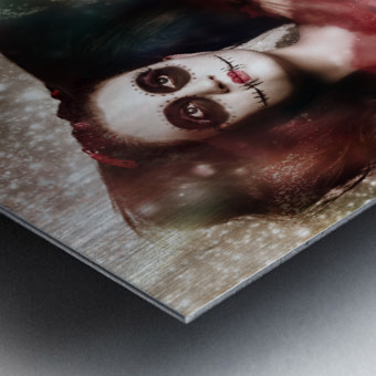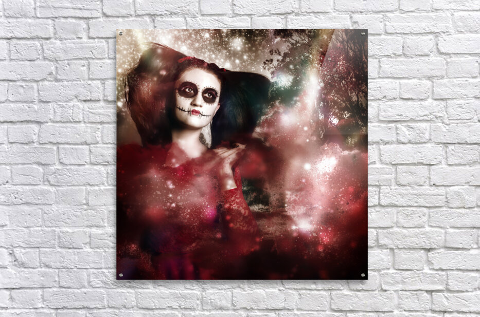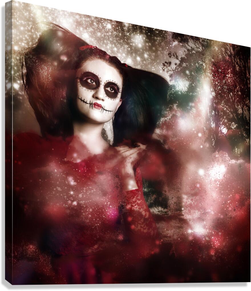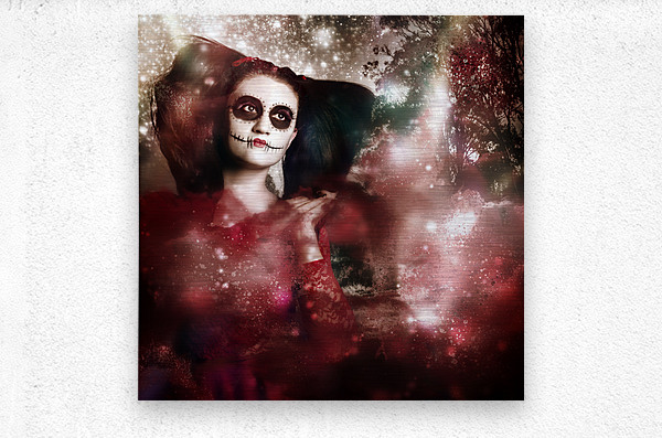 Creative dark artwork of a supernatural sugarskull girl clapping hands to create clouds of energy and light. Death and creation