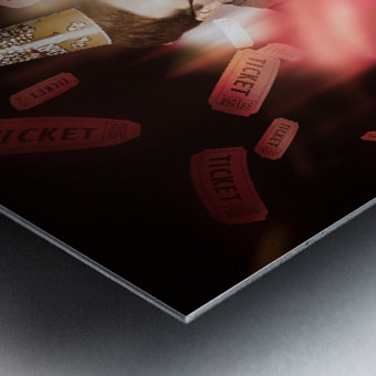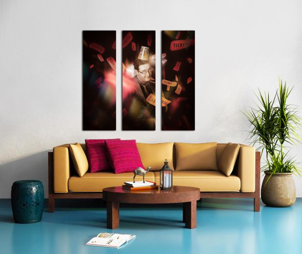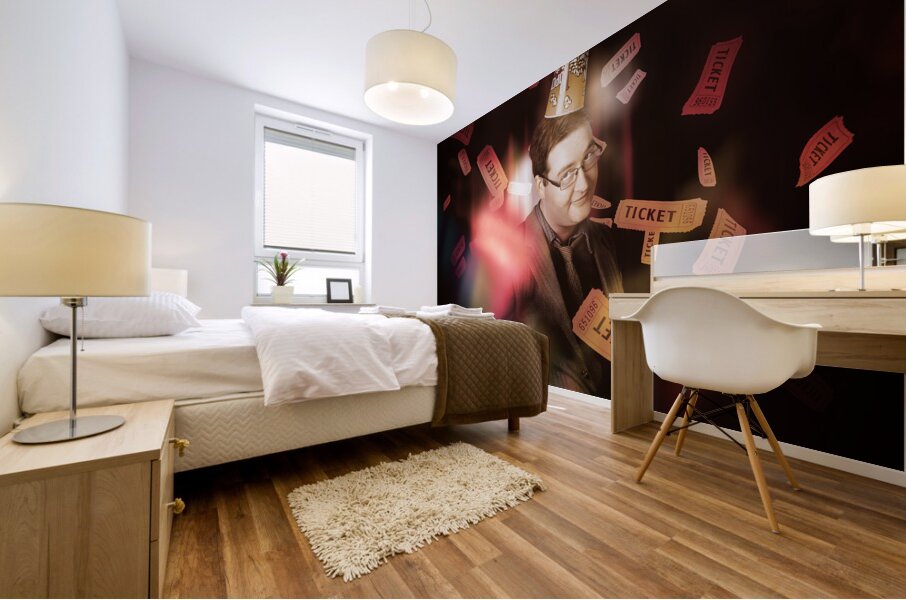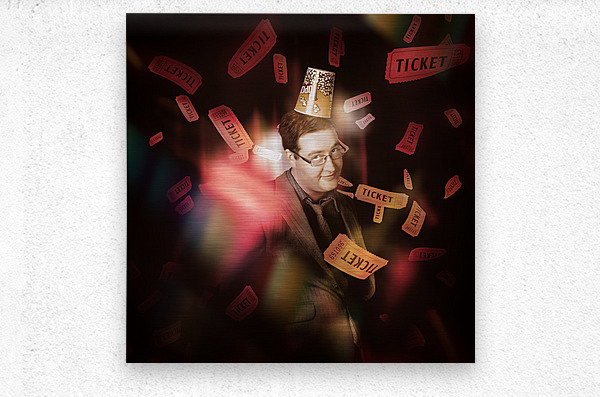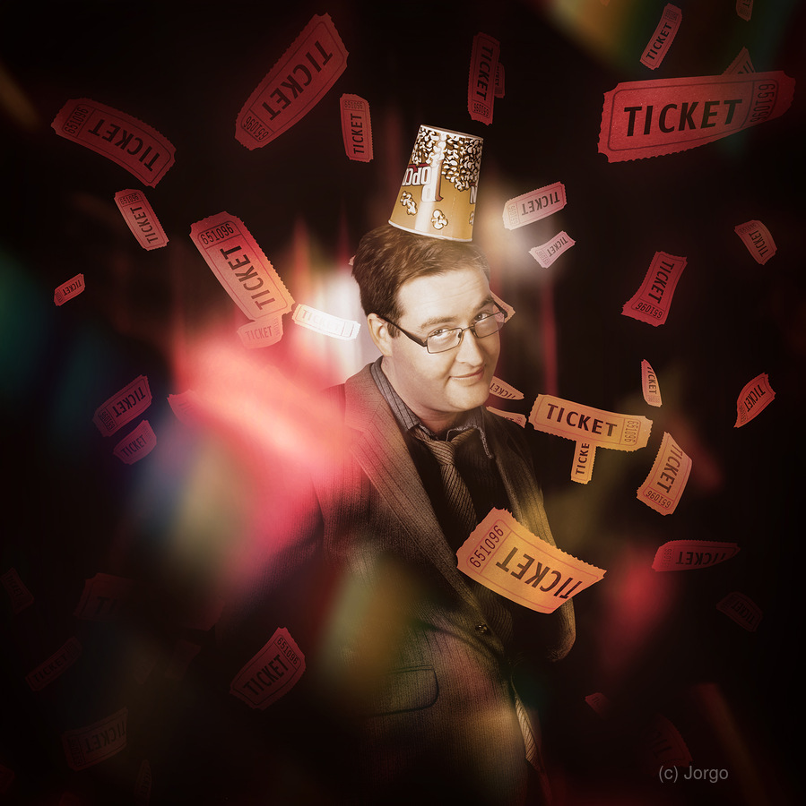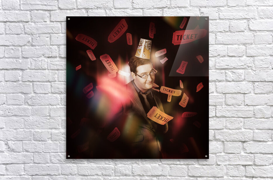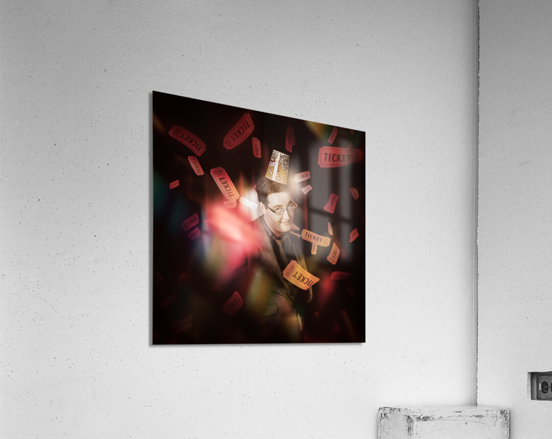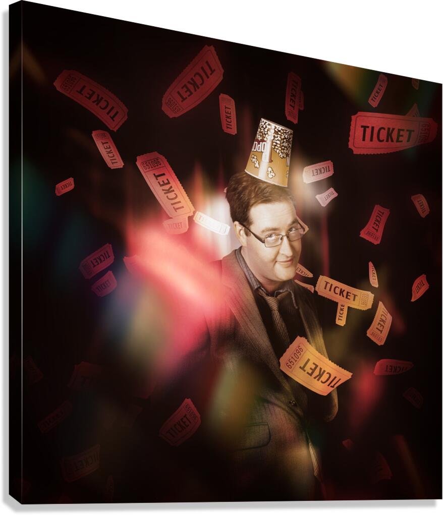 Entertainment portrait of a man wearing cinema popcorn hat standing on stage in front of red theater curtains beneath dropping movie tickets