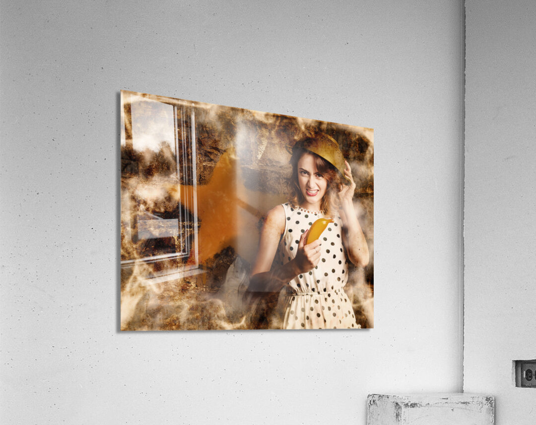 Humorous vintage housewife concept of a beautiful girl getting prepared to fight in the kitchen with strainer helmet and banana gun. Creative cooking ...[+]