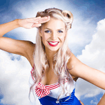 Bright clean fresh portrait against cloudy blue sky of a beautiful lively blonde Australian navy girl with a beaming radiant smile saluting with hand to her forehead in a Australia day concept