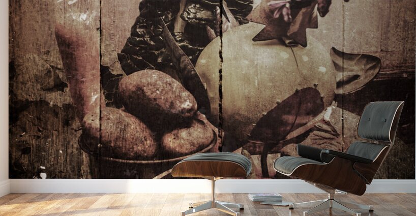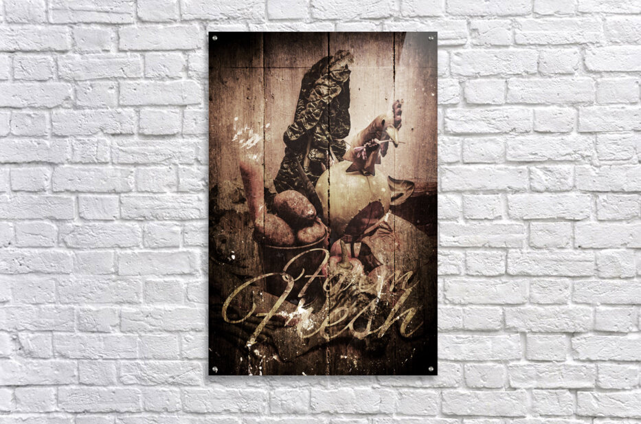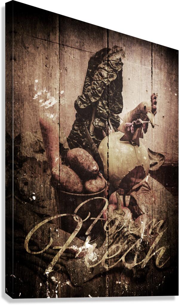 Wooden old kitchen décor artwork on a farm fresh country sign of rustic vegetables
