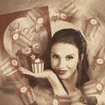 Vintage adverting of a cupcake poster girl juggling retro cakes in sweet dessert shop. Old food commercial