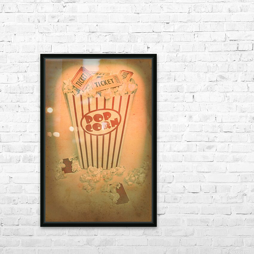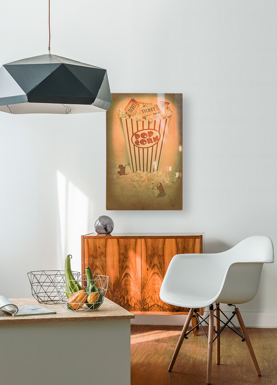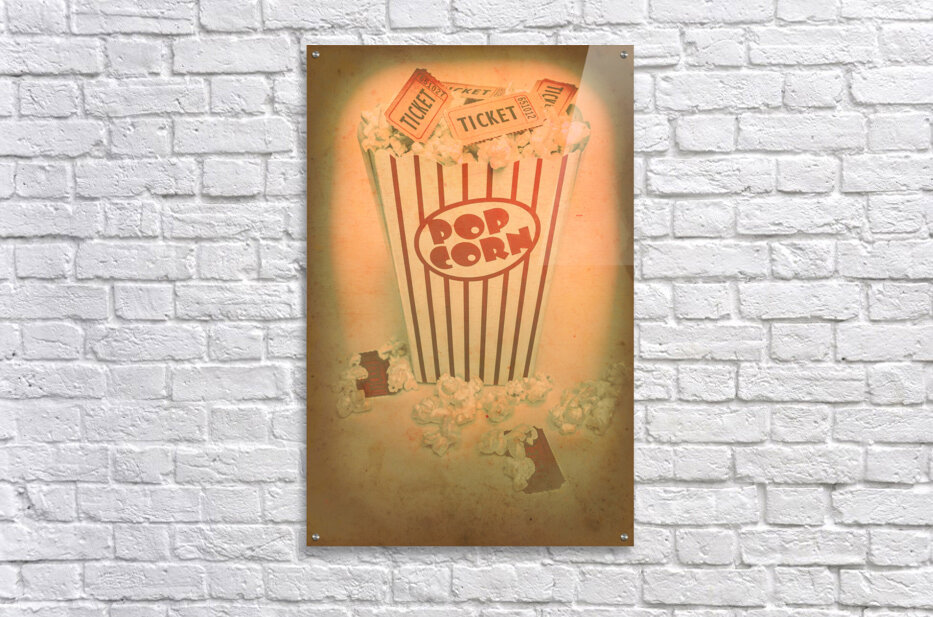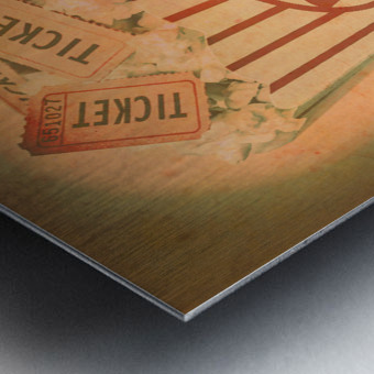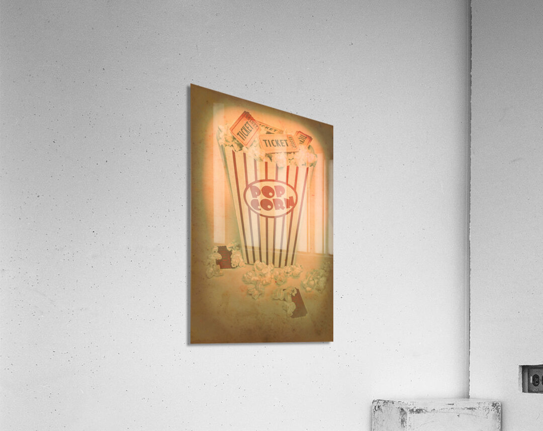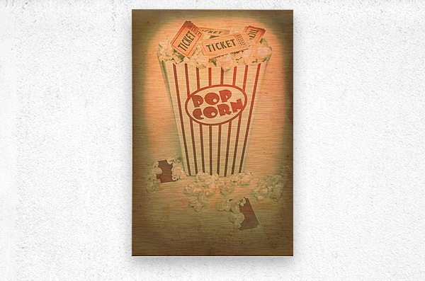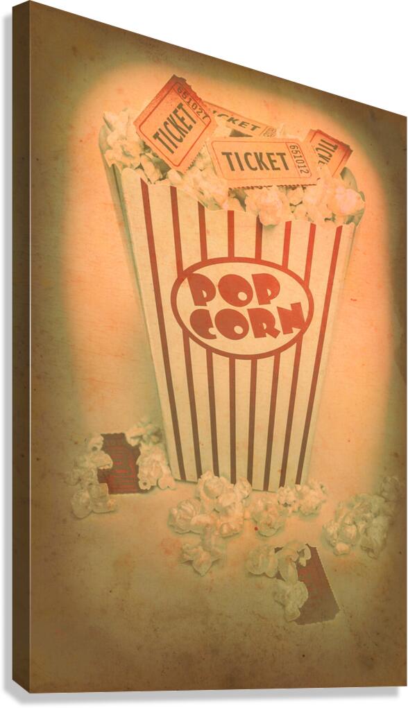 Vintage red and white striped iconic pop corn container holding film tickets in classic show business styles. Vintage cinema pop corn artwork