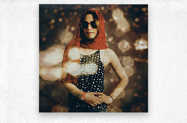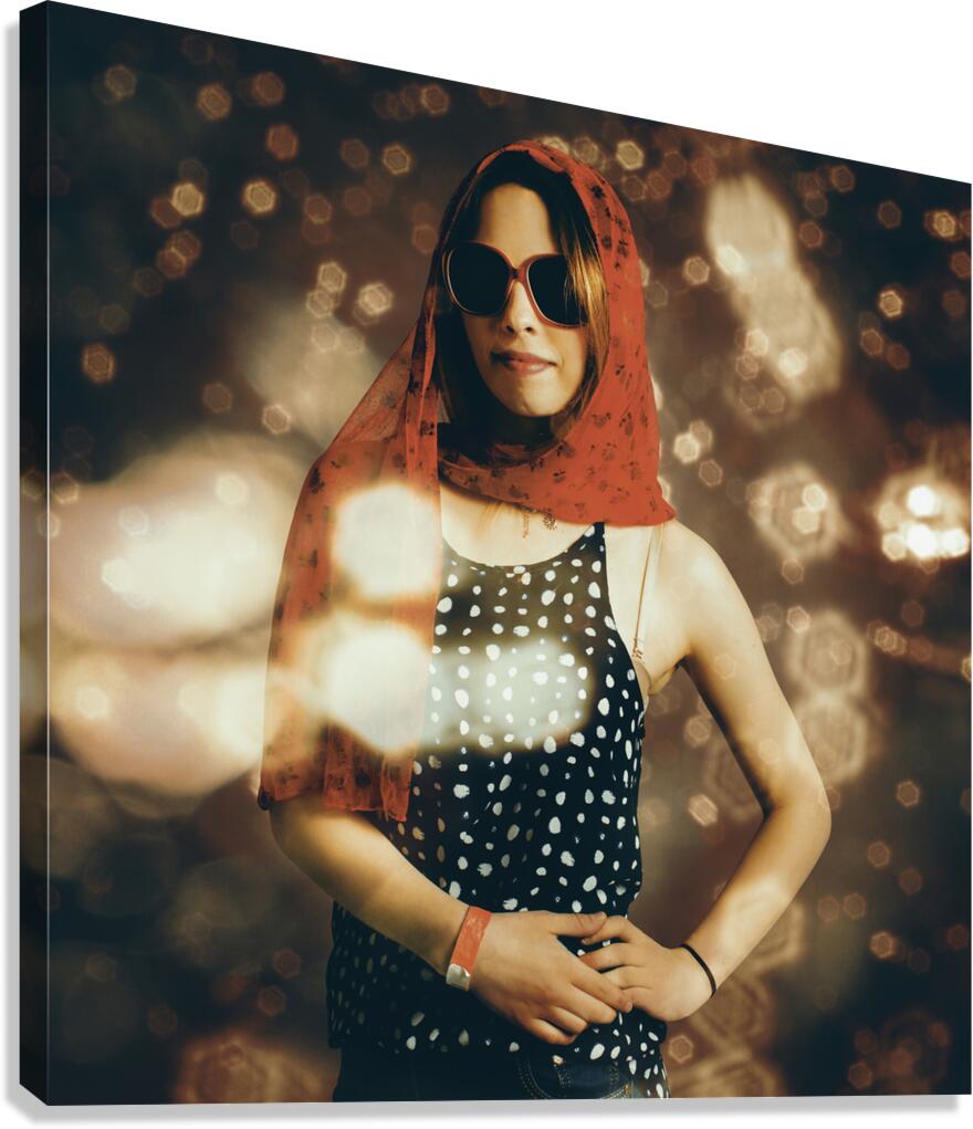 Retro model portrait on a fashionable girl in classical clothing styles walking in the bright lights of glamour while modelling at a runway catwalk sh...[+]