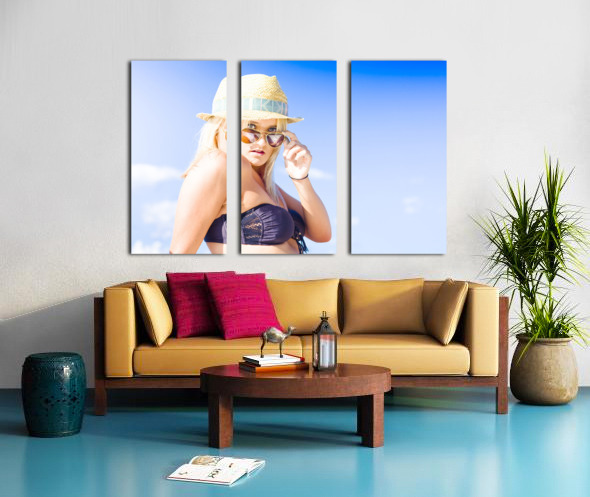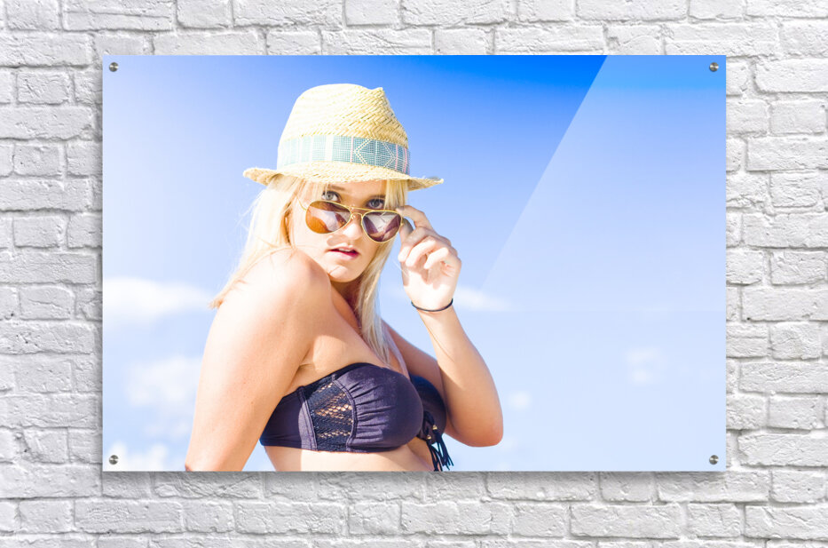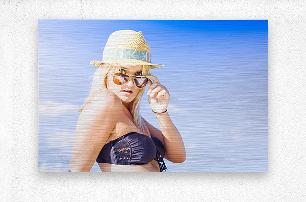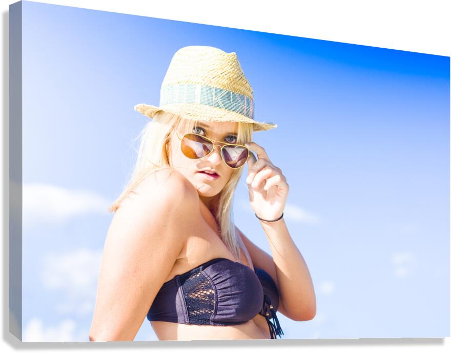 Blonde Sexy Glamour Woman Pulling Down Sun Shades With A Surprised Stunned And Shocked Expression In A Depiction Of Surprise And Shock Copyspace In Blue Sky