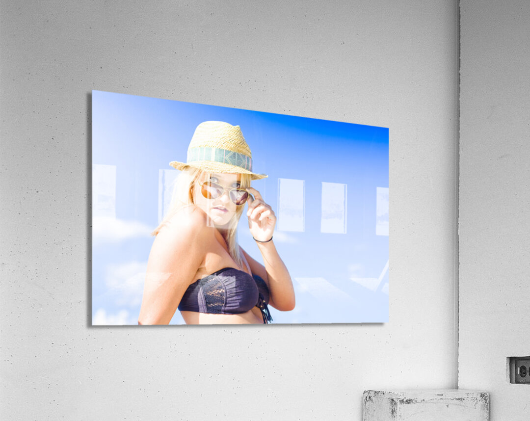 Blonde Sexy Glamour Woman Pulling Down Sun Shades With A Surprised Stunned And Shocked Expression In A Depiction Of Surprise And Shock Copyspace In Bl...[+]