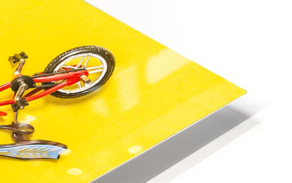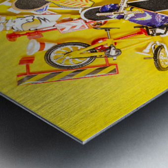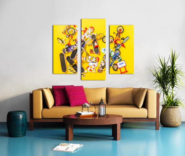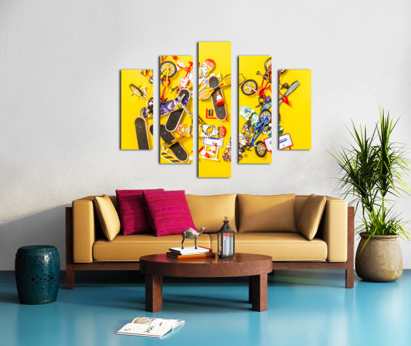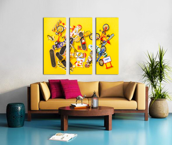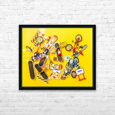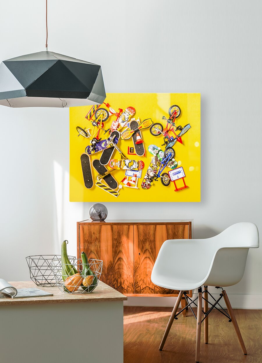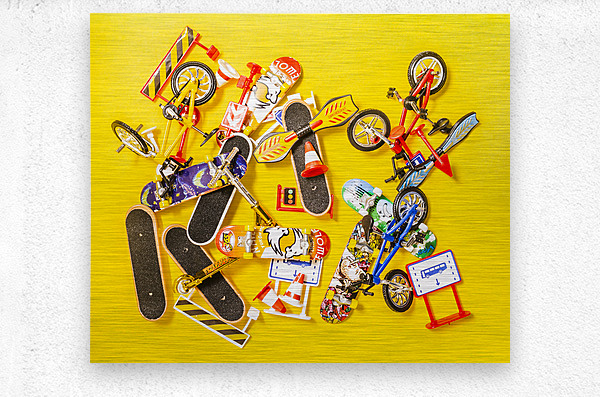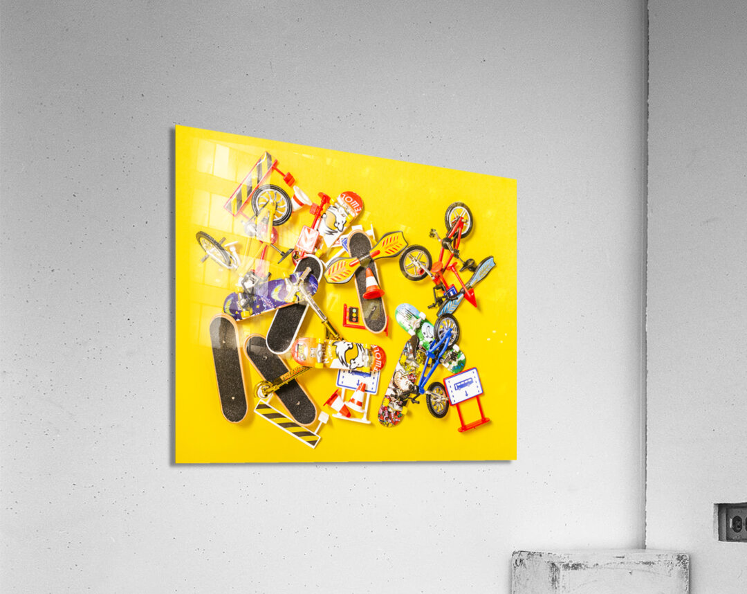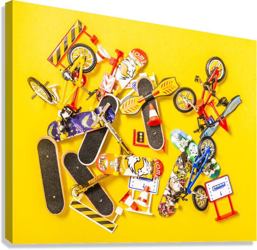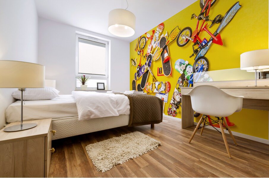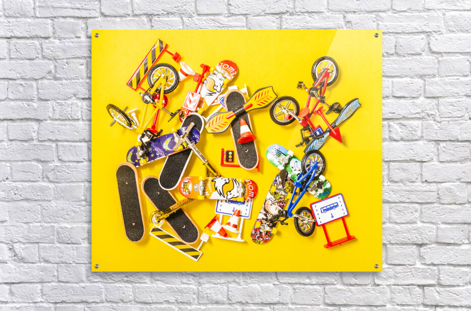 Still life art in a youthful scene of skateboard decks bikes and push scooters on yellow background. Stacks of fun