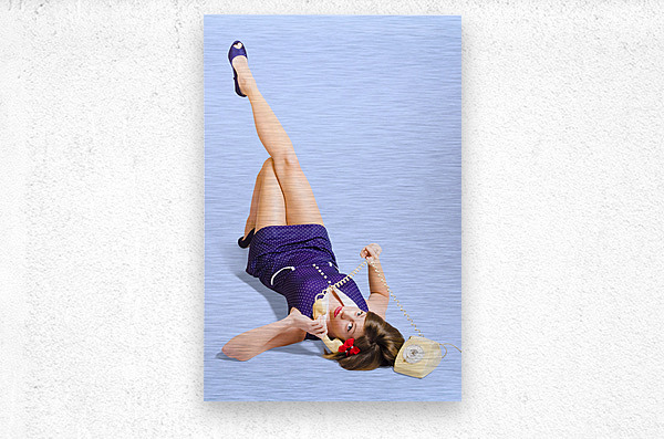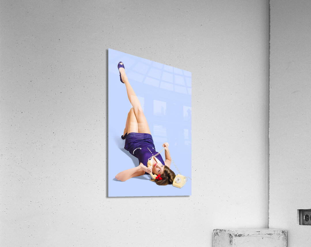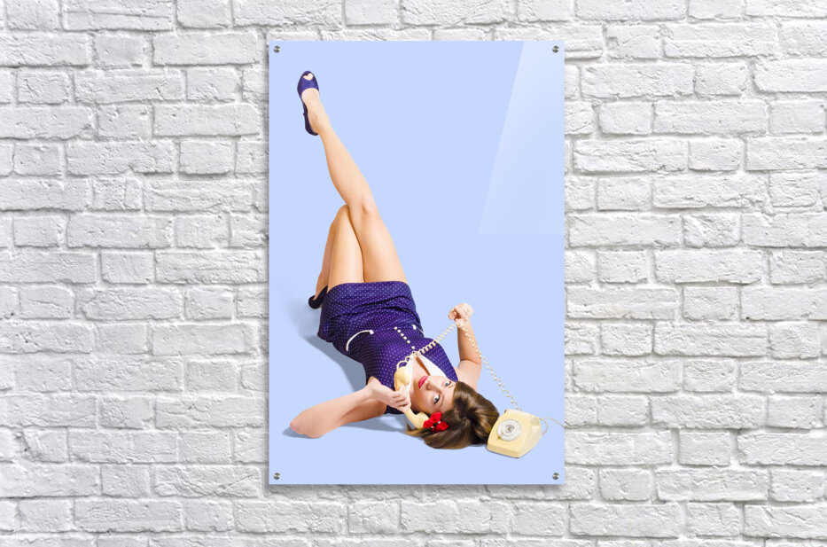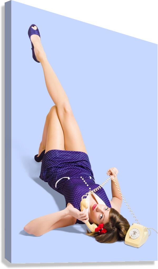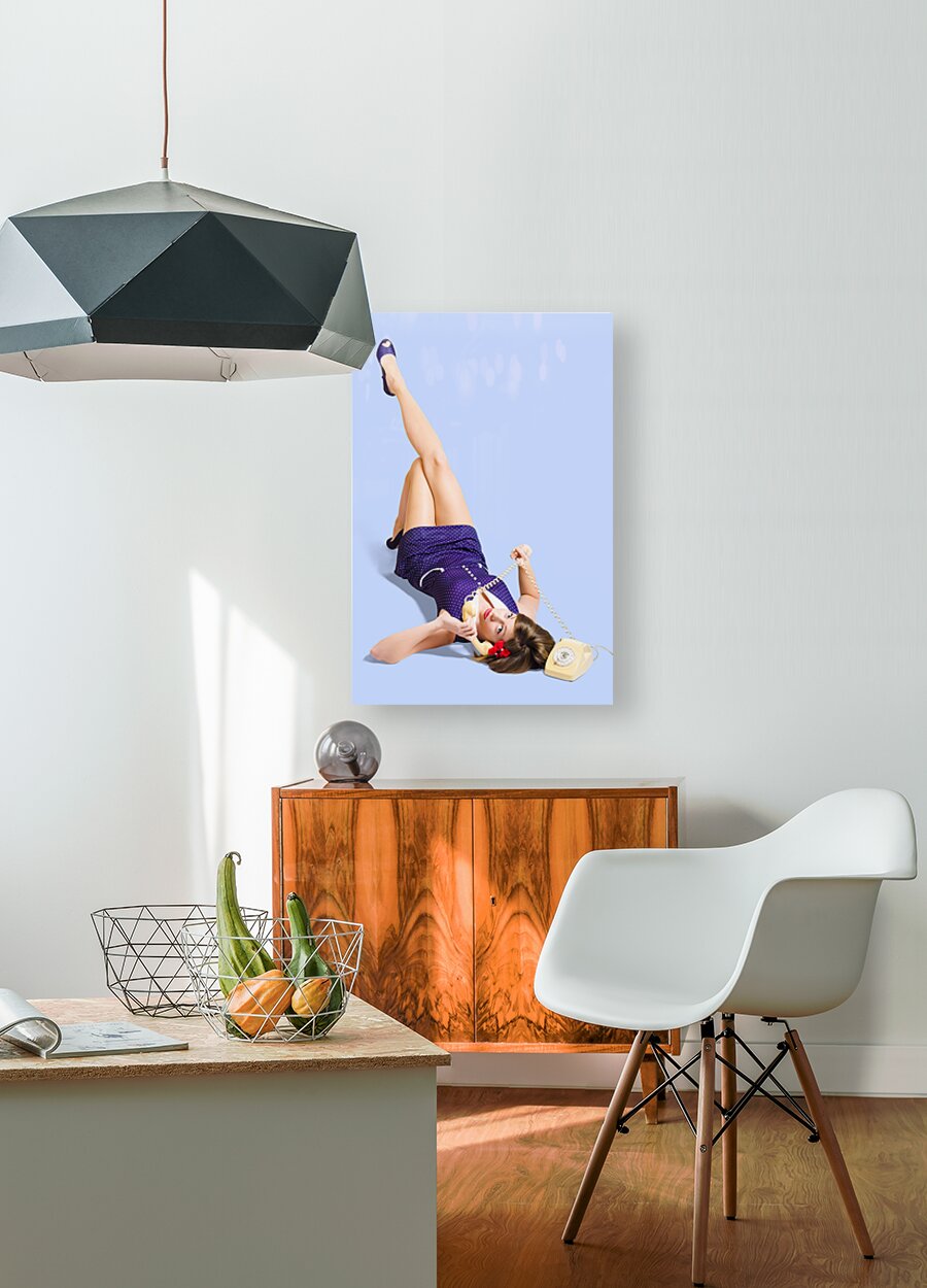 ABOUT THIS ARTWORK: WOMAN TALKING ON ANTIQUE LANDLINE PHONE ON WHITE