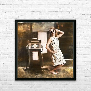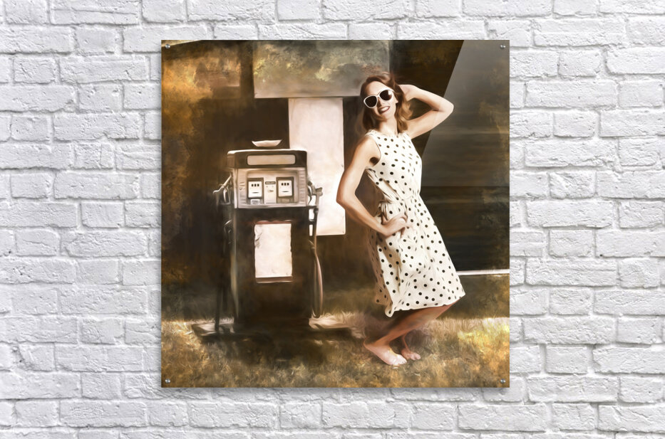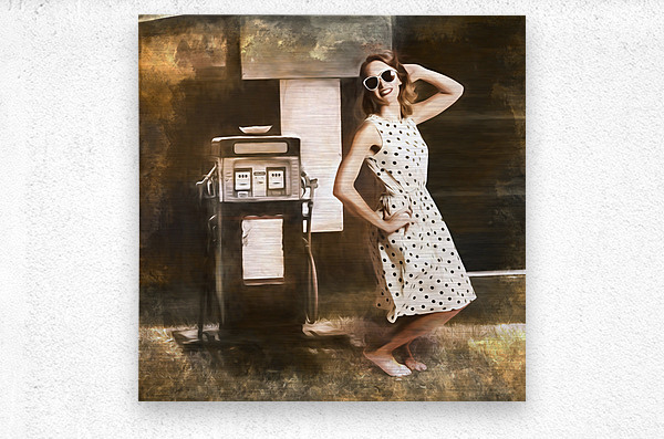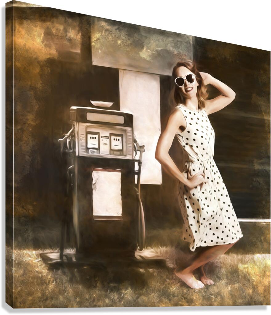 Fine art digital painting of a vintage gas pump girl striking a fashionable pose in fifties style housewife clothing. Roadhouse petrol pump pinup