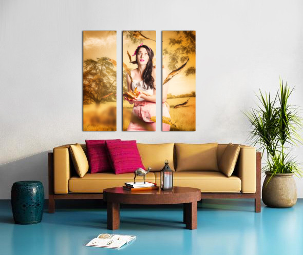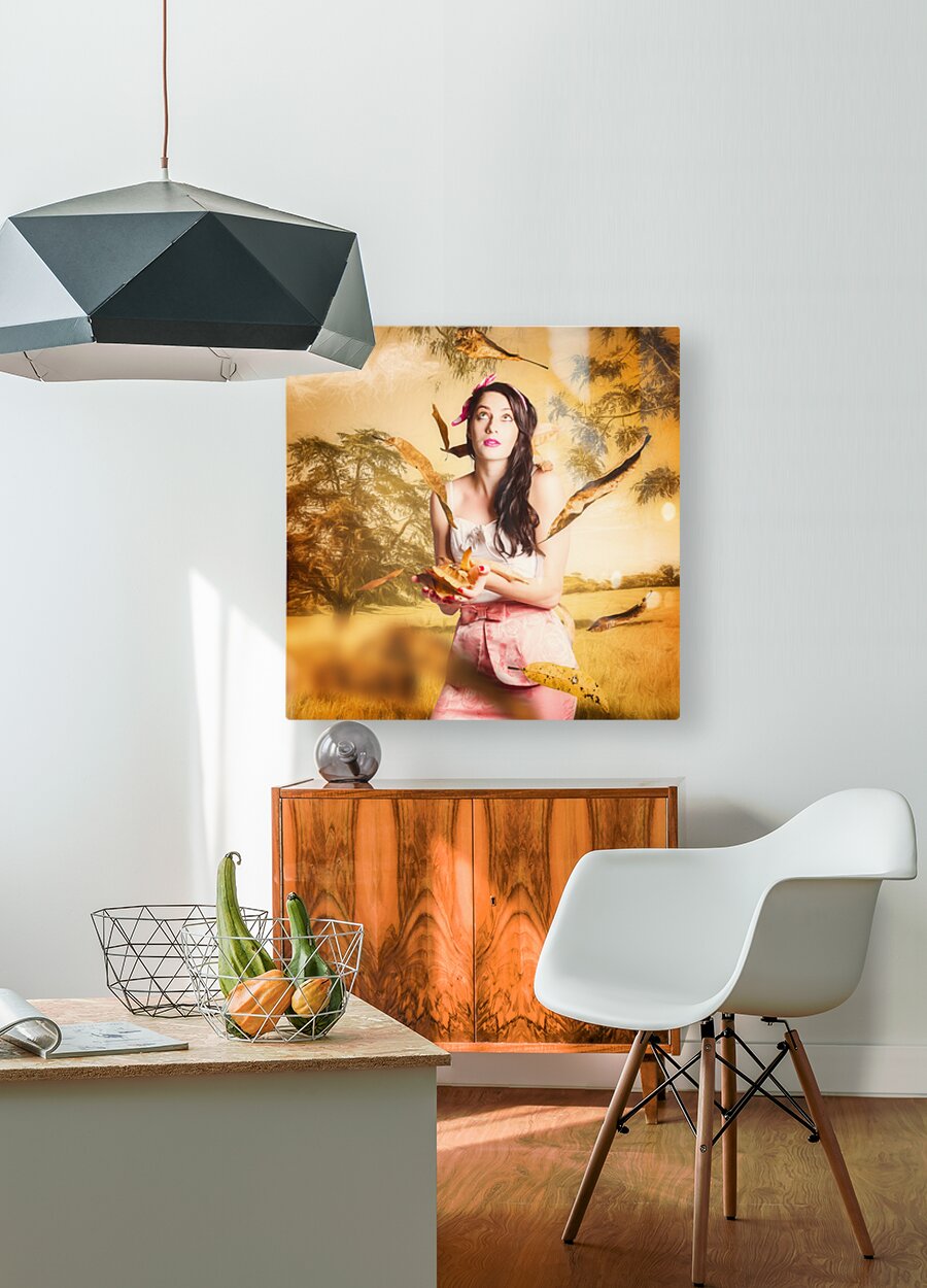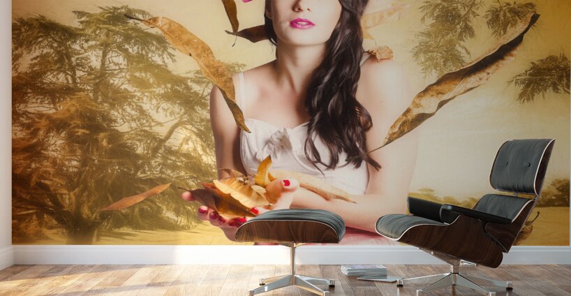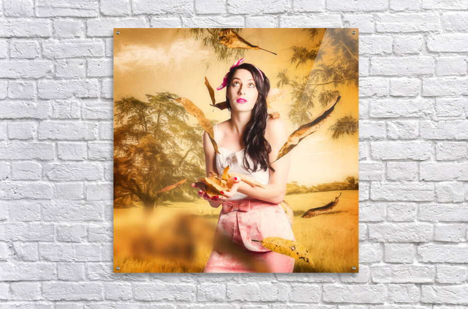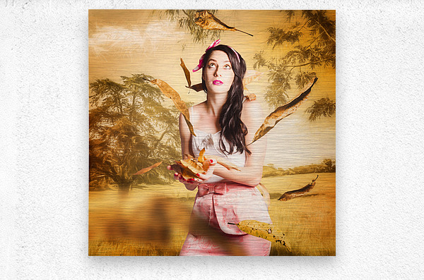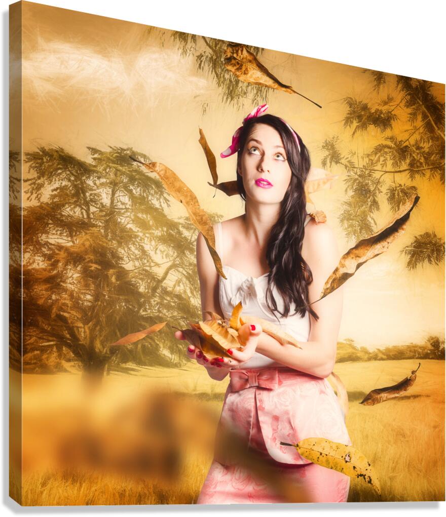 Fine art fantasy image of a beautiful autumn pinup woman catching falling leaves in an Australian sketched windy park. Fall fashion
