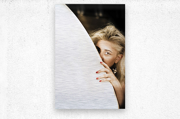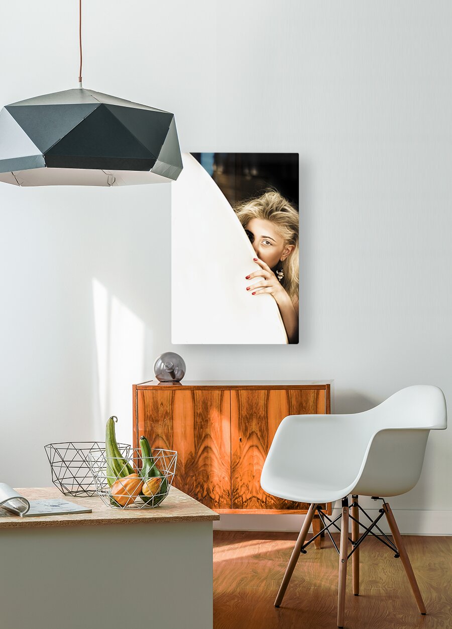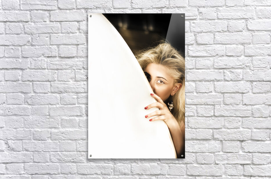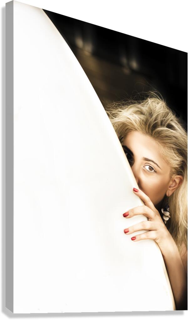 Cute Sexy Surfer Blond Woman Hides Behind Large White Surf Board On A Dark Beach Outdoors In A Water Sport Image Space For Text On Surfboard