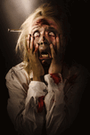 Dark horror portrait of a dying bloody zombie griping face with hands in fear and terror while looking up to the light. A passing scream between heaven and hell
