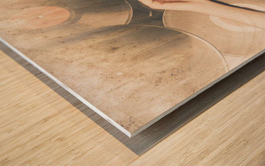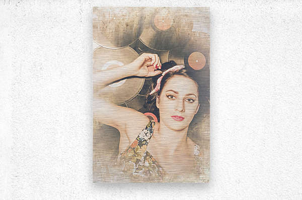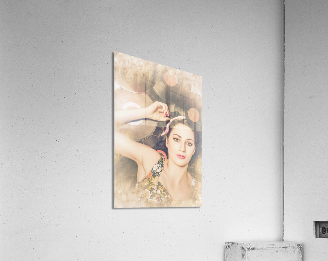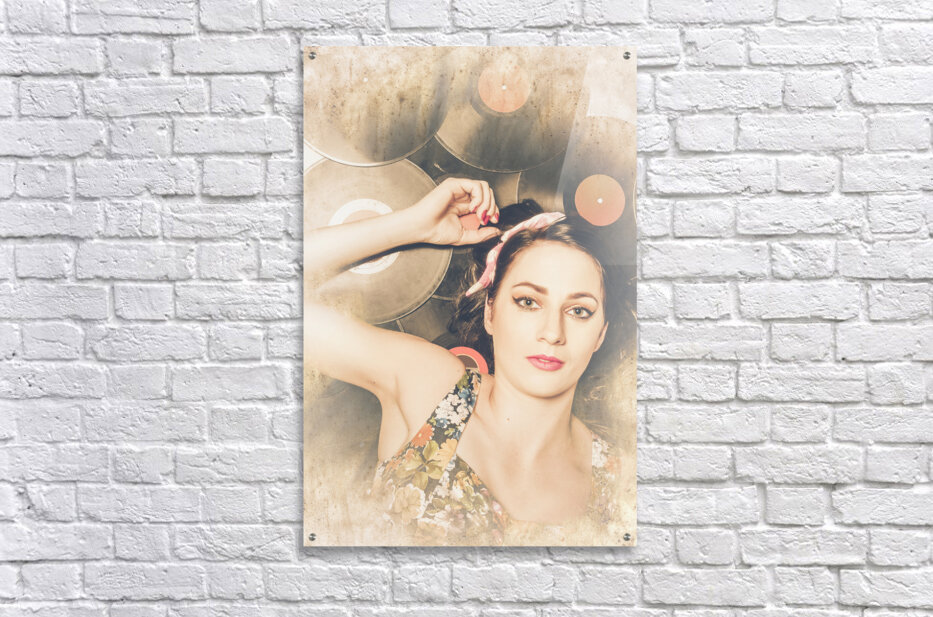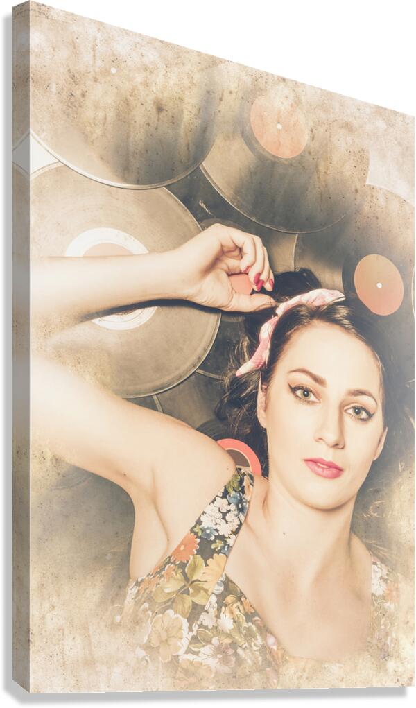 Vintage textured disco photo of a retro party girl lying on a stack of retro vinyl records. Jukebox pin up