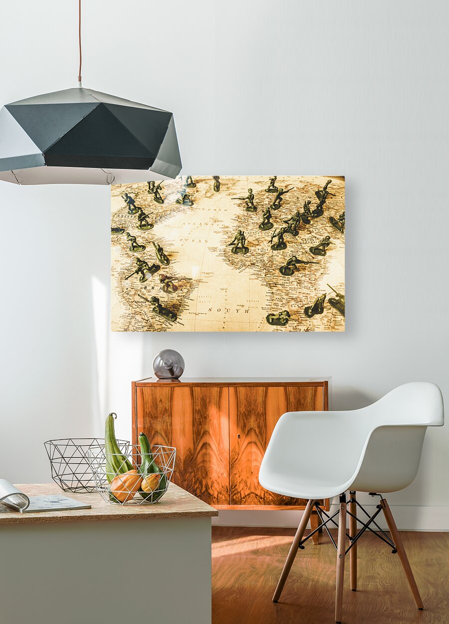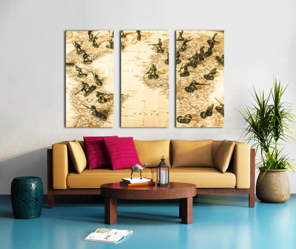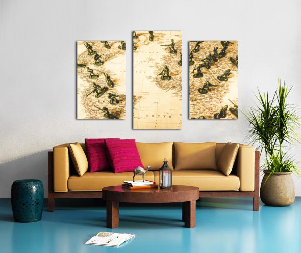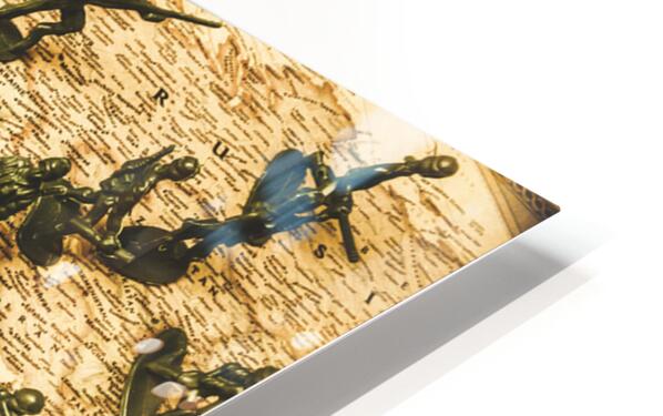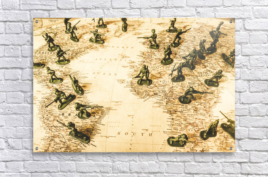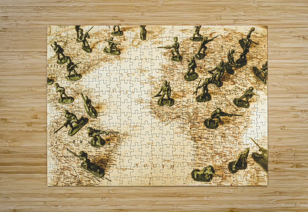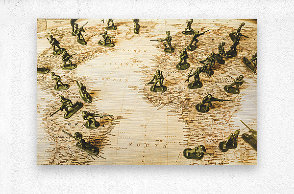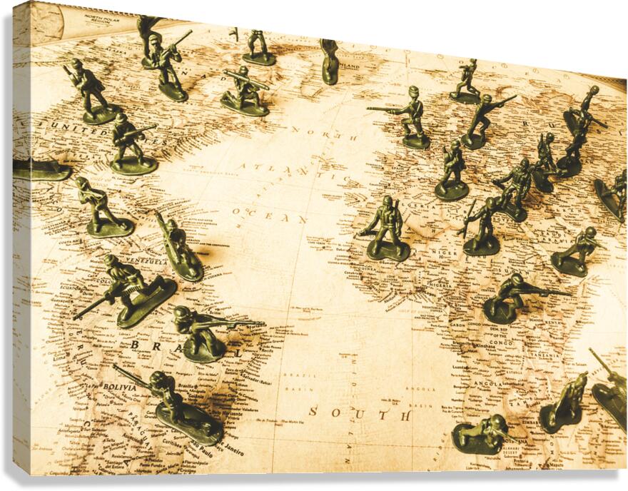 Still life military photo on toy military troopers battling out on the map of a staged world war