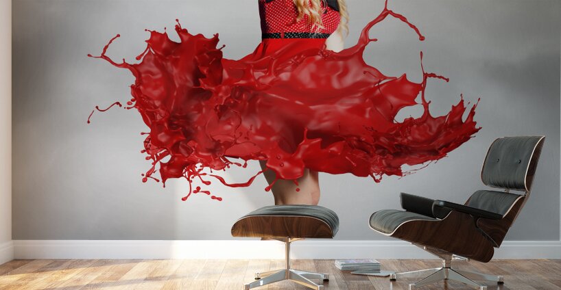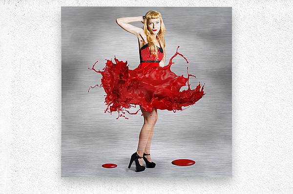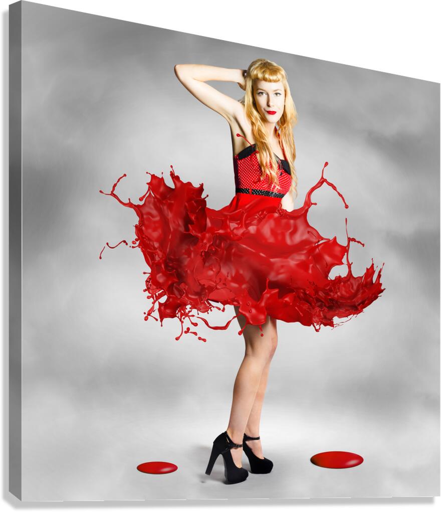 Creative fashion artwork of a gorgeous blond woman dancing in a spray of splashing color. Paint dress pin-up