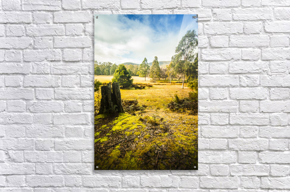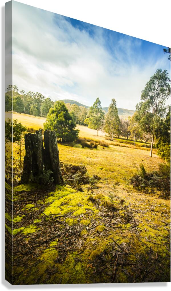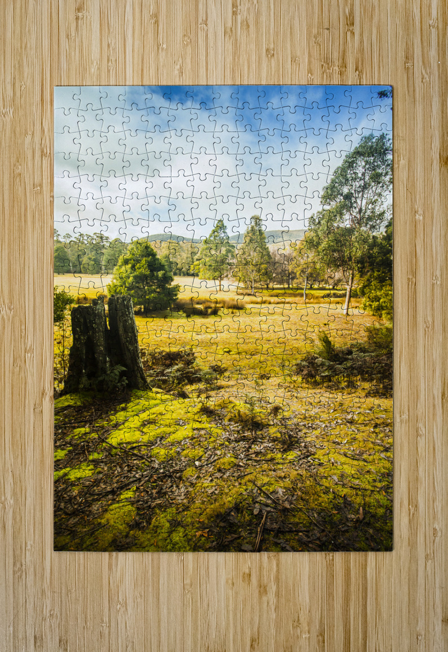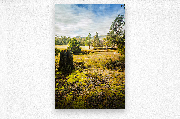 Vertical background of a bright and colourful forestry grassland opening to distant hills and a cloudy blue sky Mt Field National Park Tasmania Austra...[+]