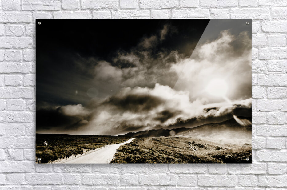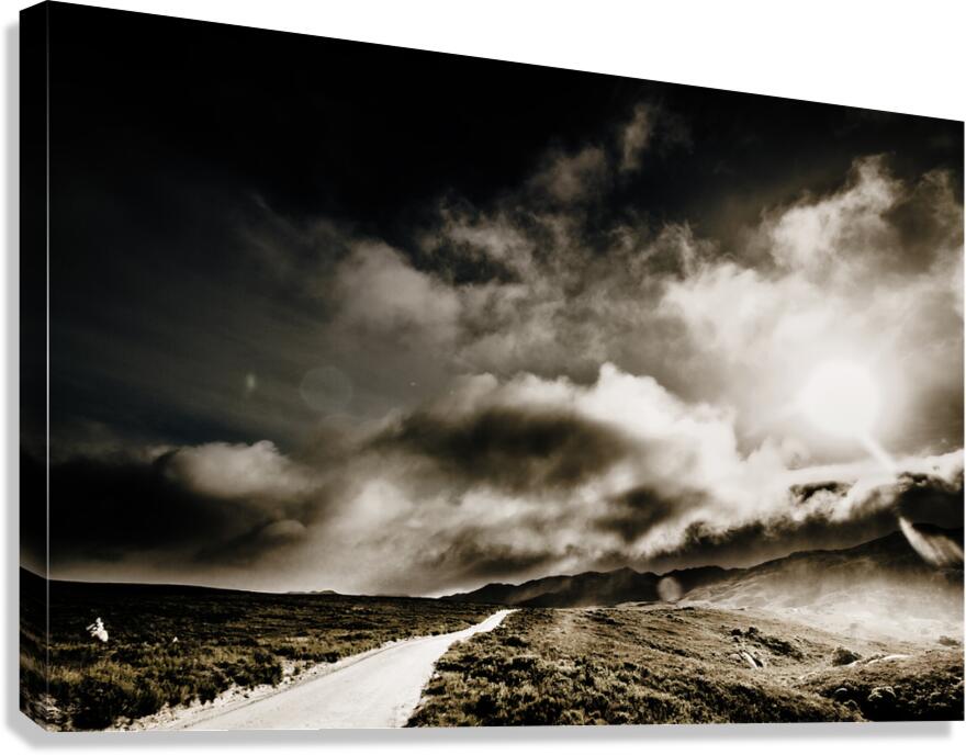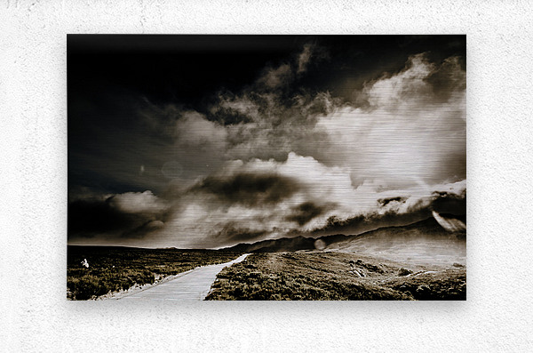 Dramatic dark path leading through a vast space of storm covered turbulence. Road from Trial Harbour to Zeehan Tasmania Australia