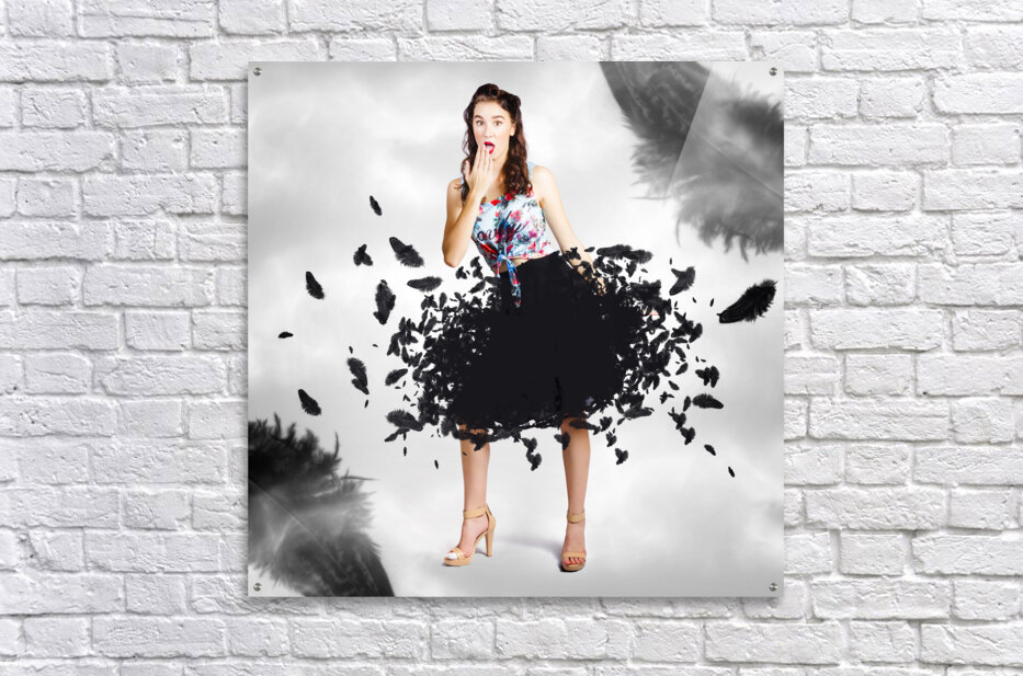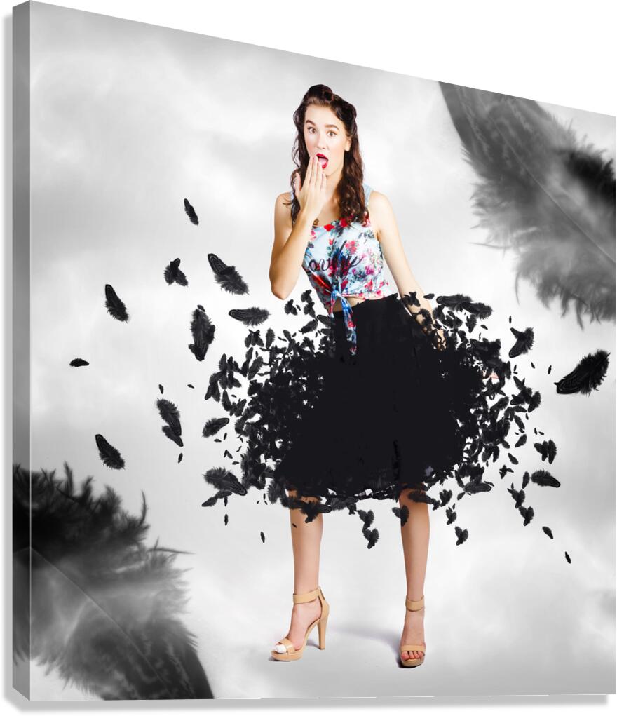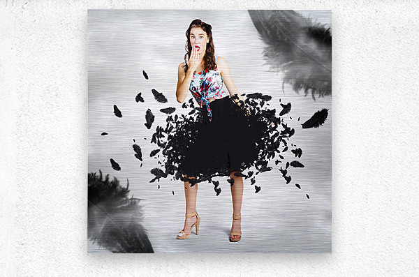 Artistic fashion shot of a beautiful young brunette pin-up woman in gorgeous feather skirt dancing out a motion in creativity. Unique fashion styles