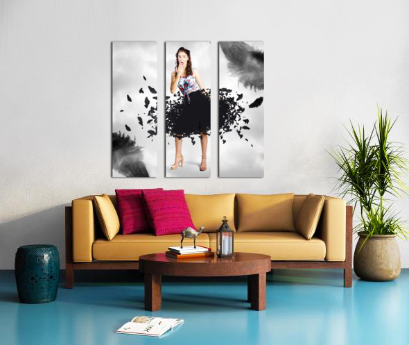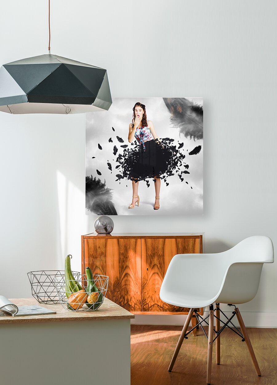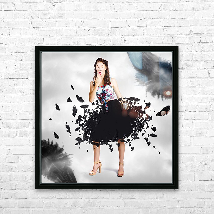Brunette pin-up woman in gorgeous feather skirt Frame print