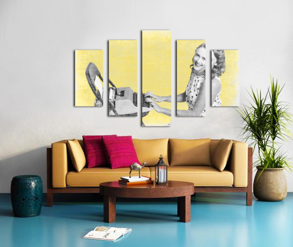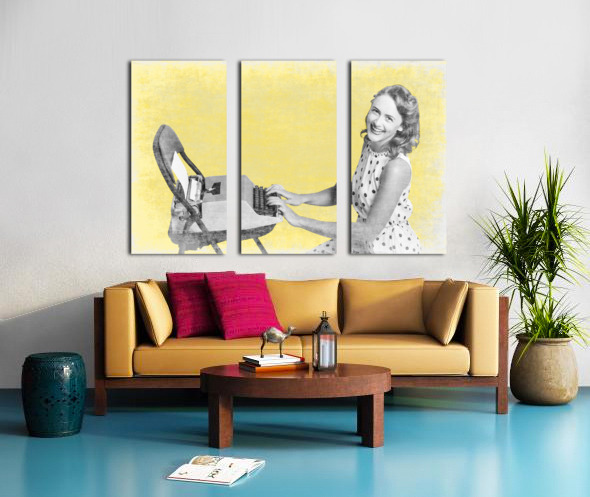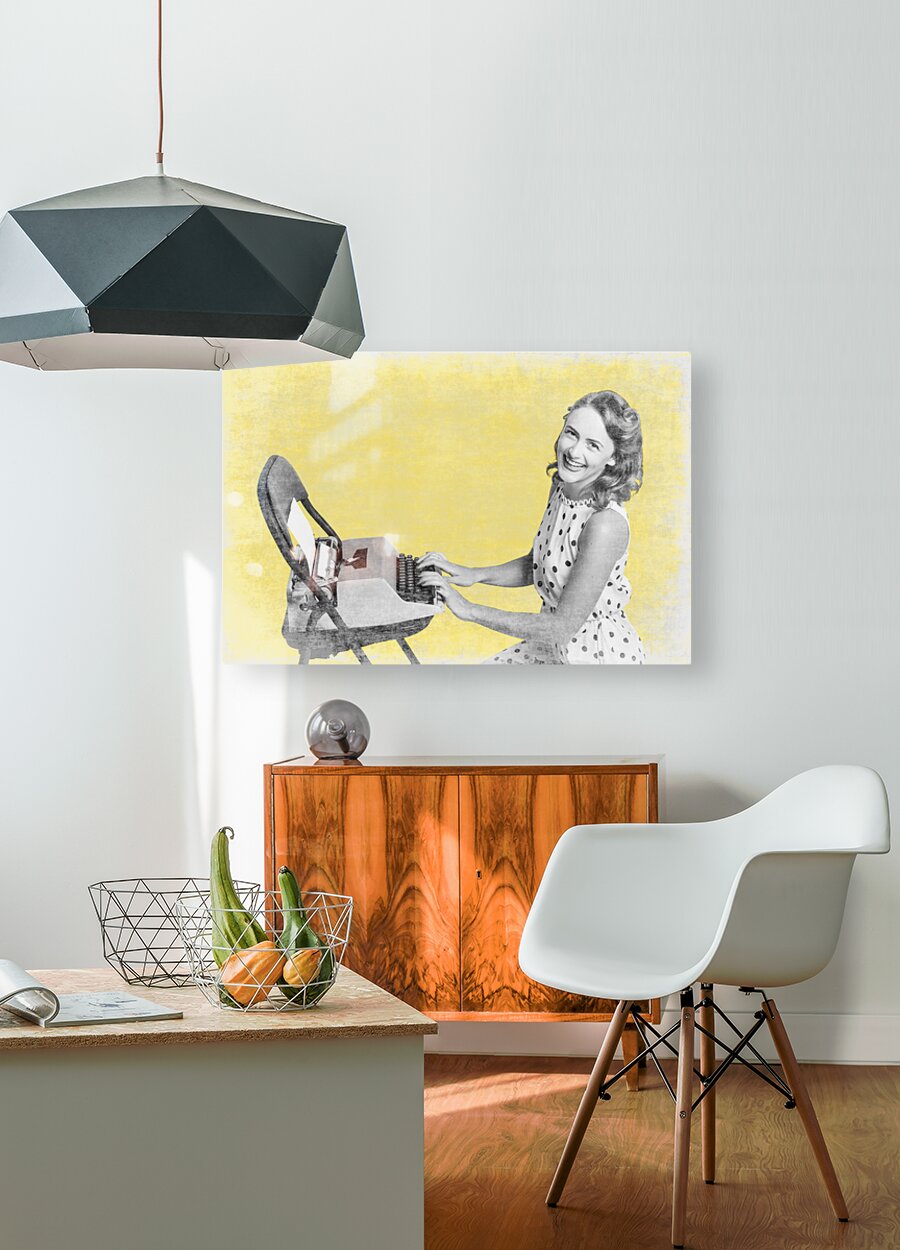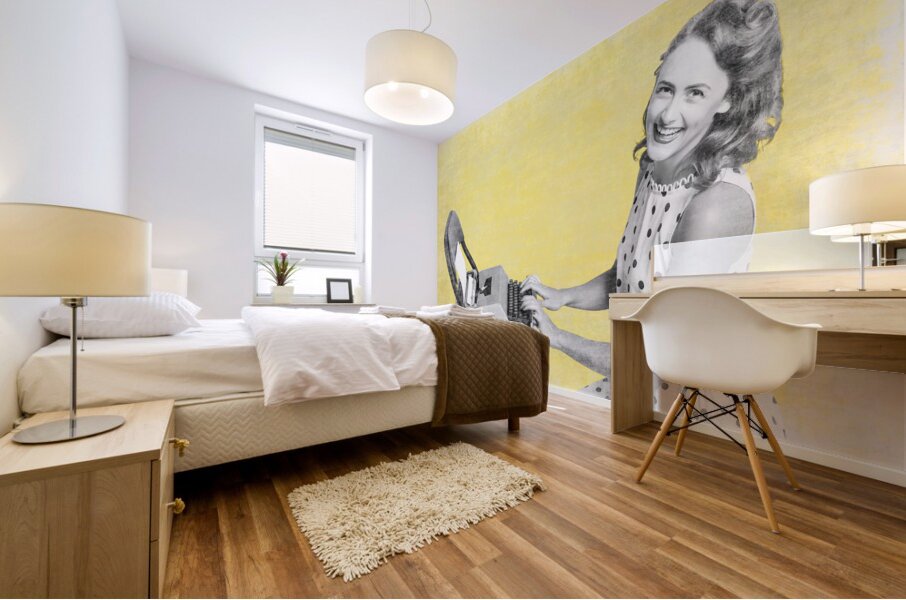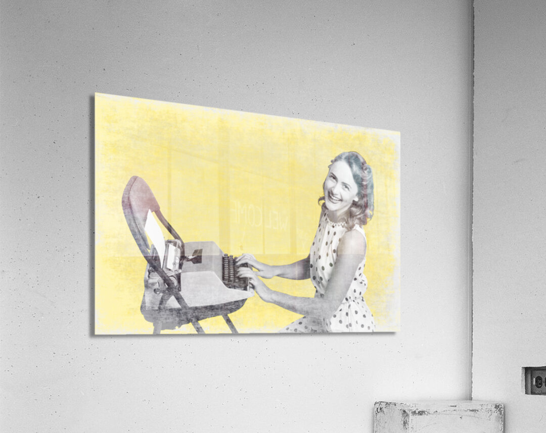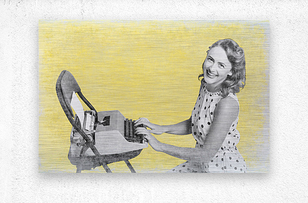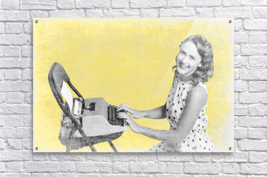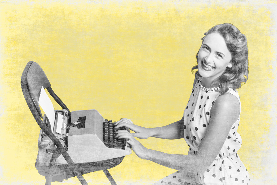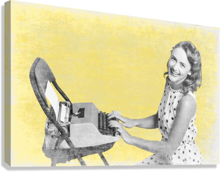 Retro yellow styled image of a beautiful old styled pin-up secretary laughing while writing notes and letters on old-fashion typewriter on vintage texture wallpaper. Old products advert