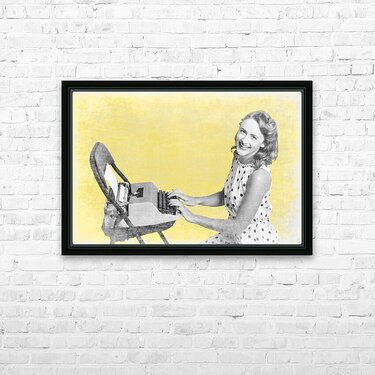 Retro yellow styled image of a beautiful old styled pin-up secretary laughing while writing notes and letters on old-fashion typewriter on vintage tex...[+]