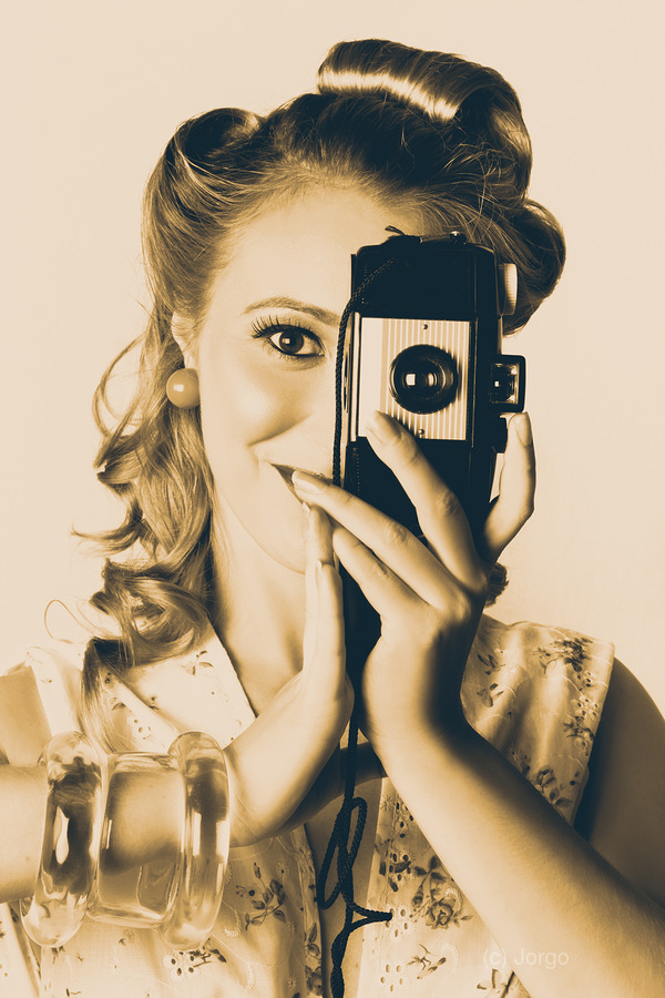 Old Grunge Photograph Of A Female Fashion Photographer Turning Film Camera Vertical To Portrait When Capturing People Images