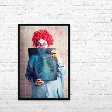 Scary clown peeking behind x-ray. Funny bones Picture Frame Printing