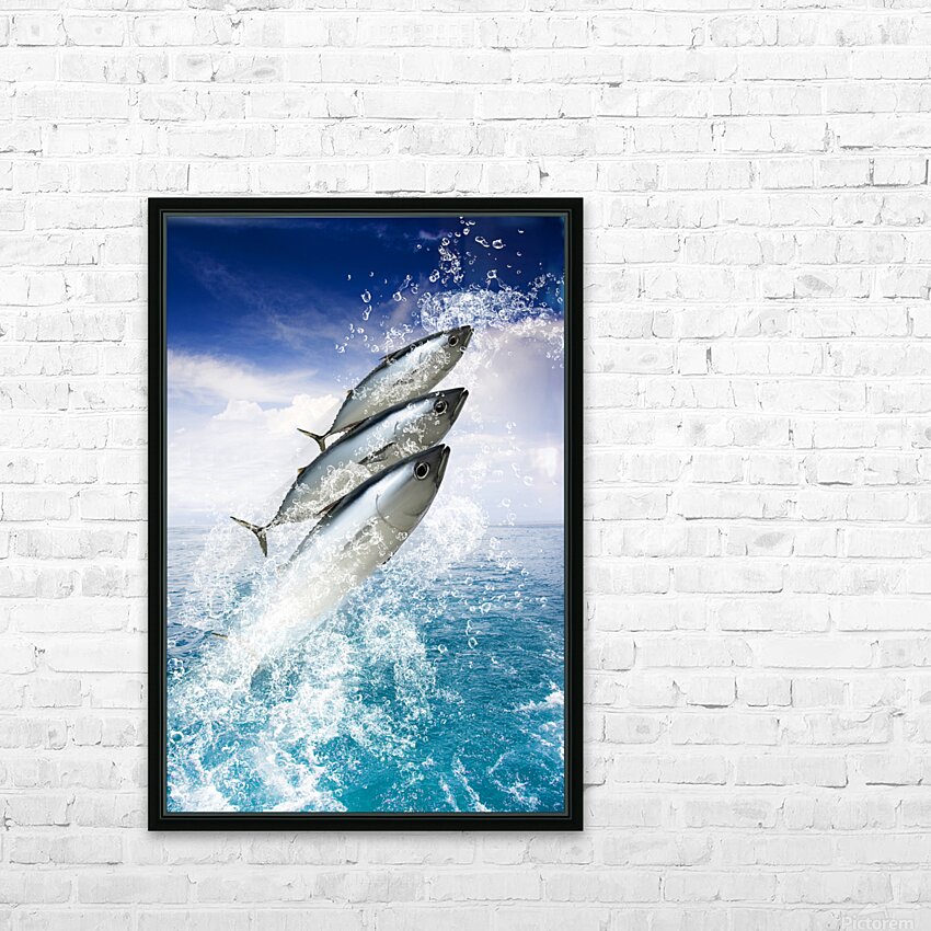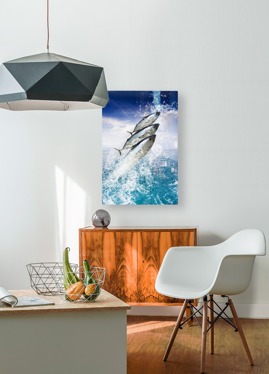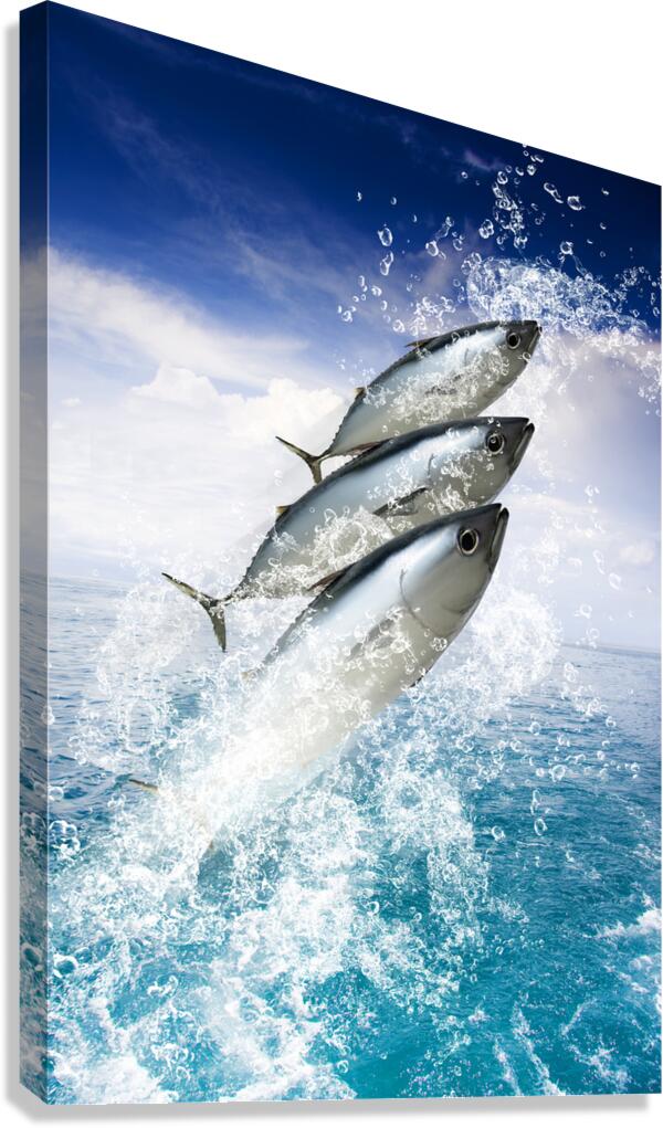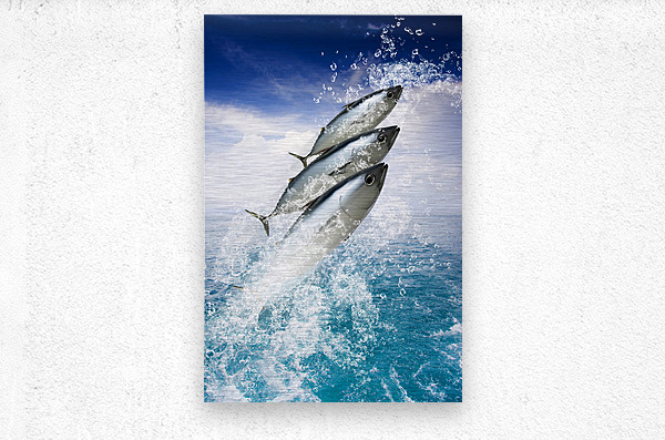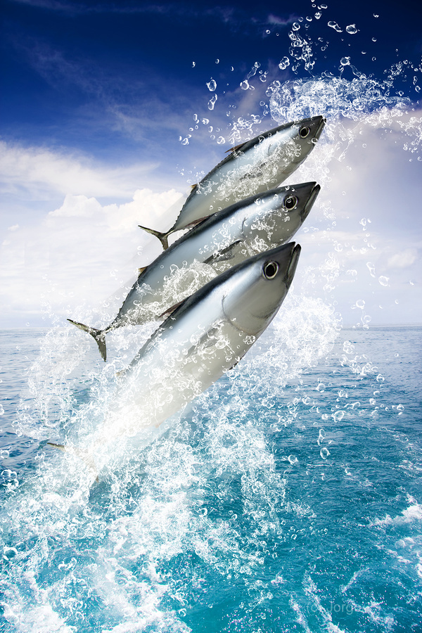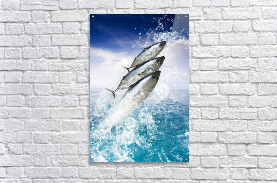 Three Fish Splash Out Of A Pristine Aquatic Ocean While Water Droplets Spray Skywards In A Holiday And Getaway Concept