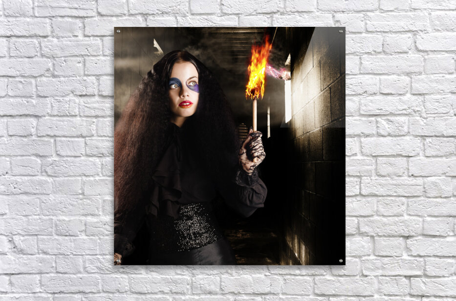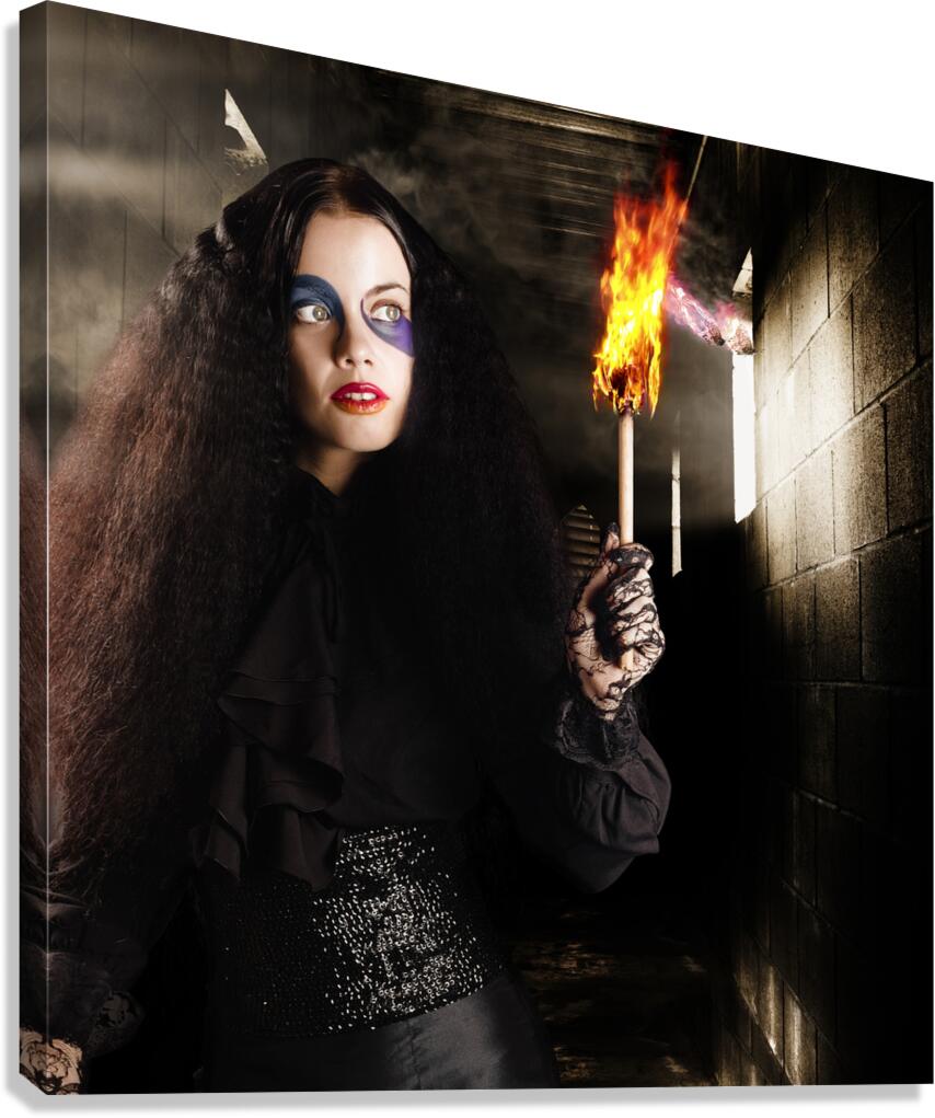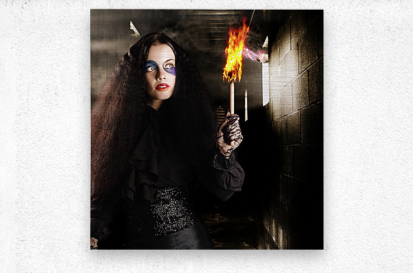 Dramatic portrait of a fantasy jester walking through a mysterious castle dungeon with flaming torch light. Dark ages