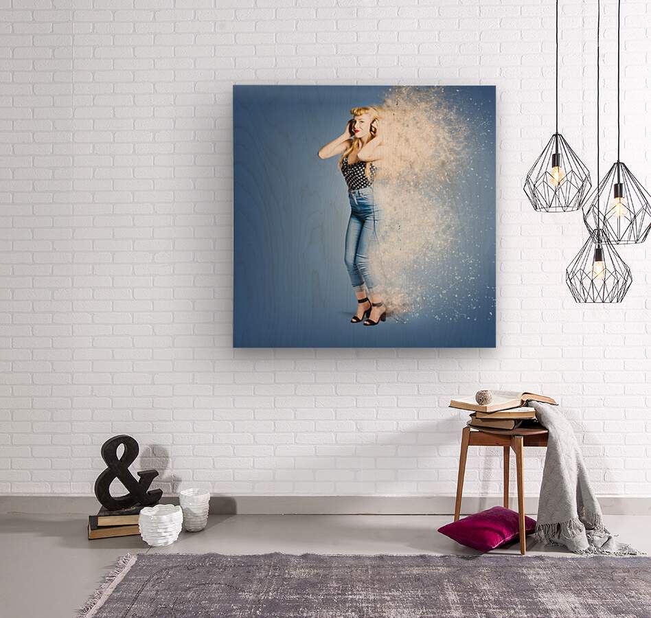 Abstract audio concept of a pin up woman in headphones getting a powerful audio blast of dust and fragments. Retro music explosion