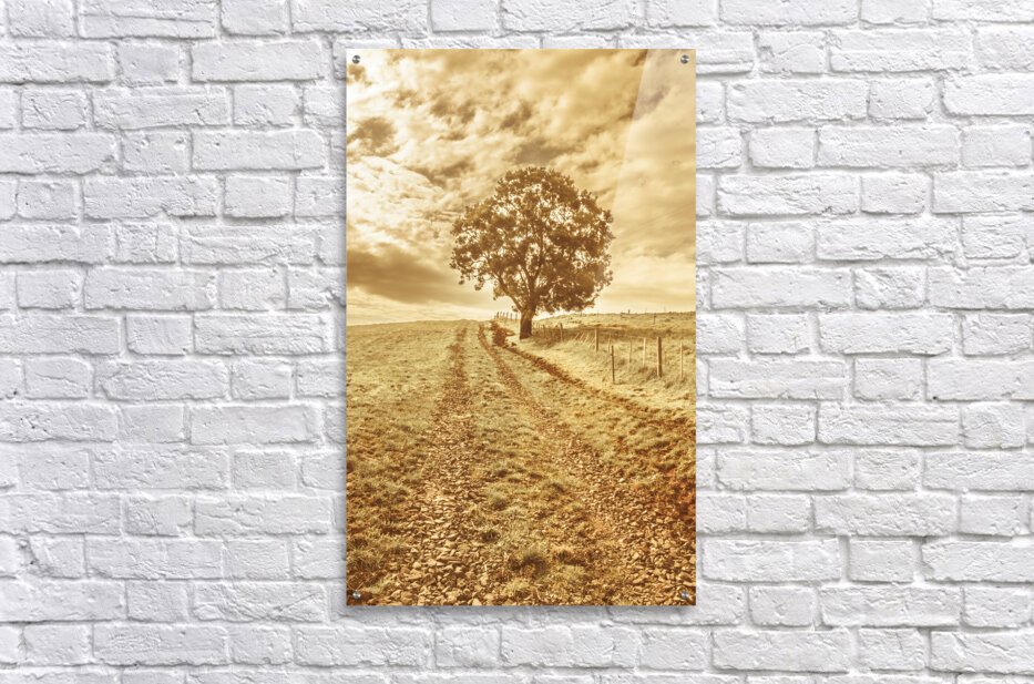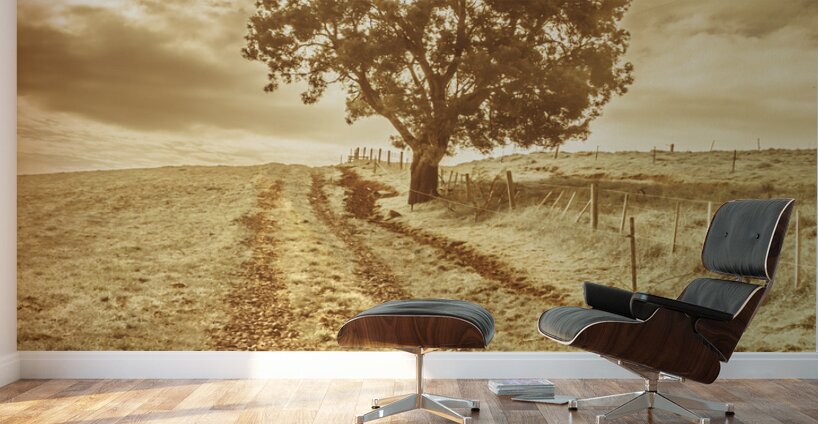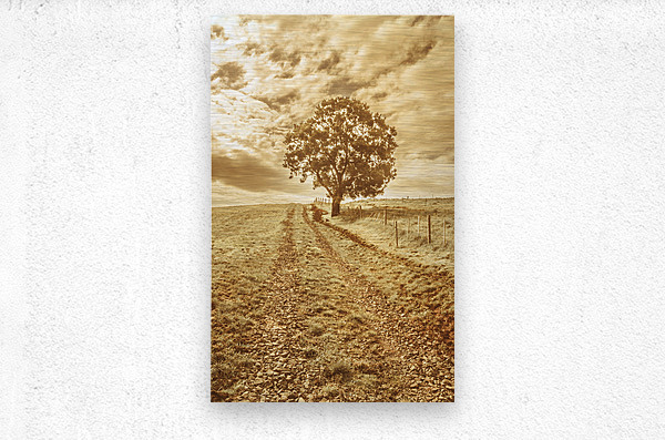 Tasmania farming landscape of a single tree along a countryside dirt track traversing open paddocks. Taken Northern Tassie at Camena Australia
