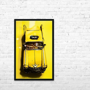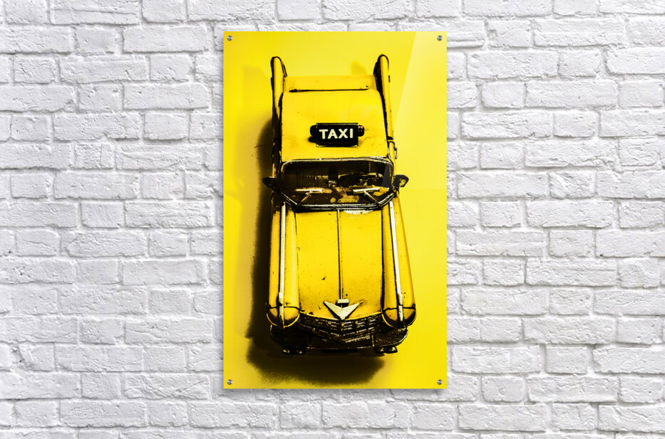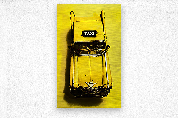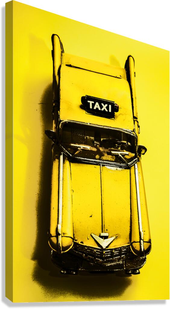 Retro style photo on an iconic America tin taxi cab on bright background. Yellow A-Fare